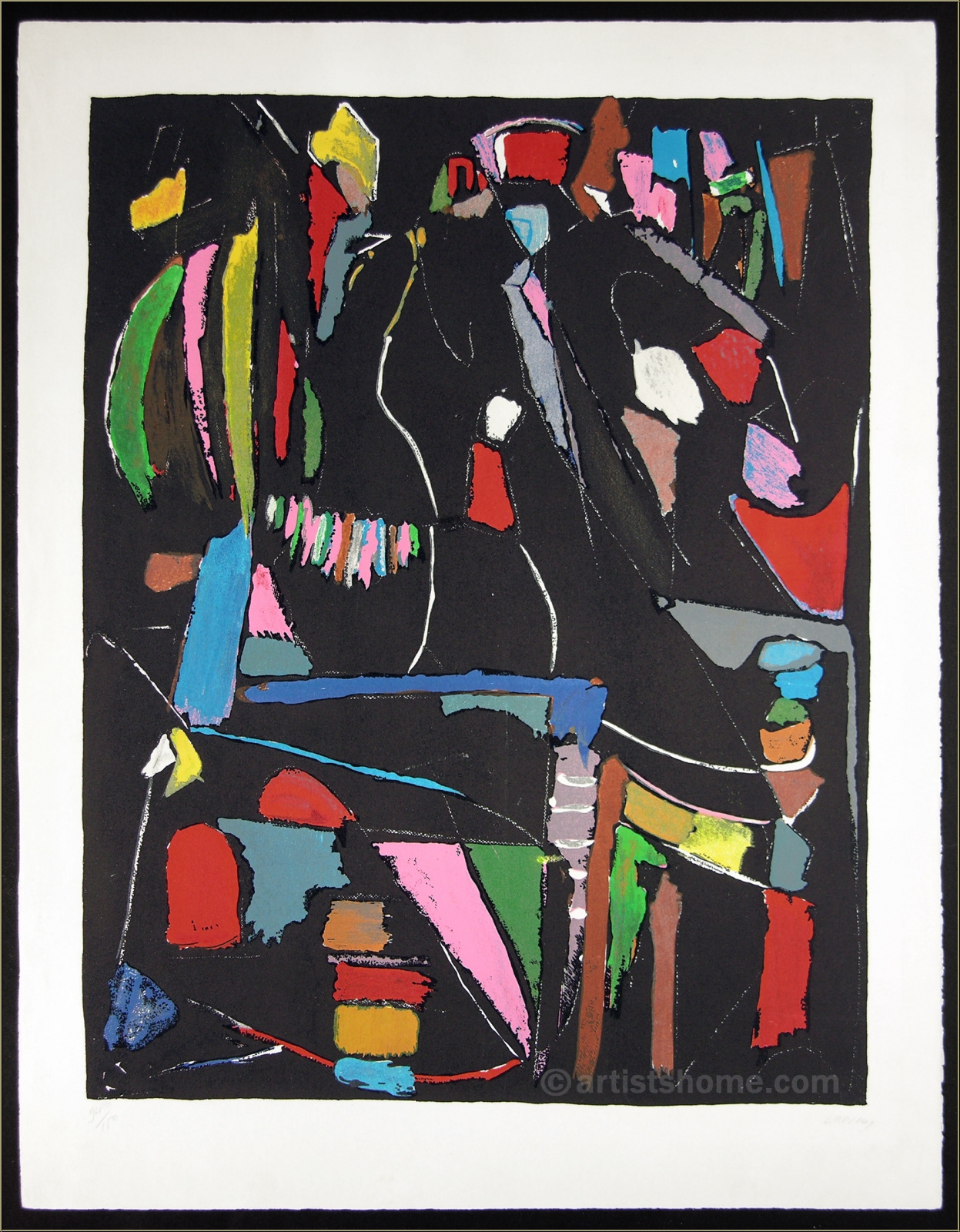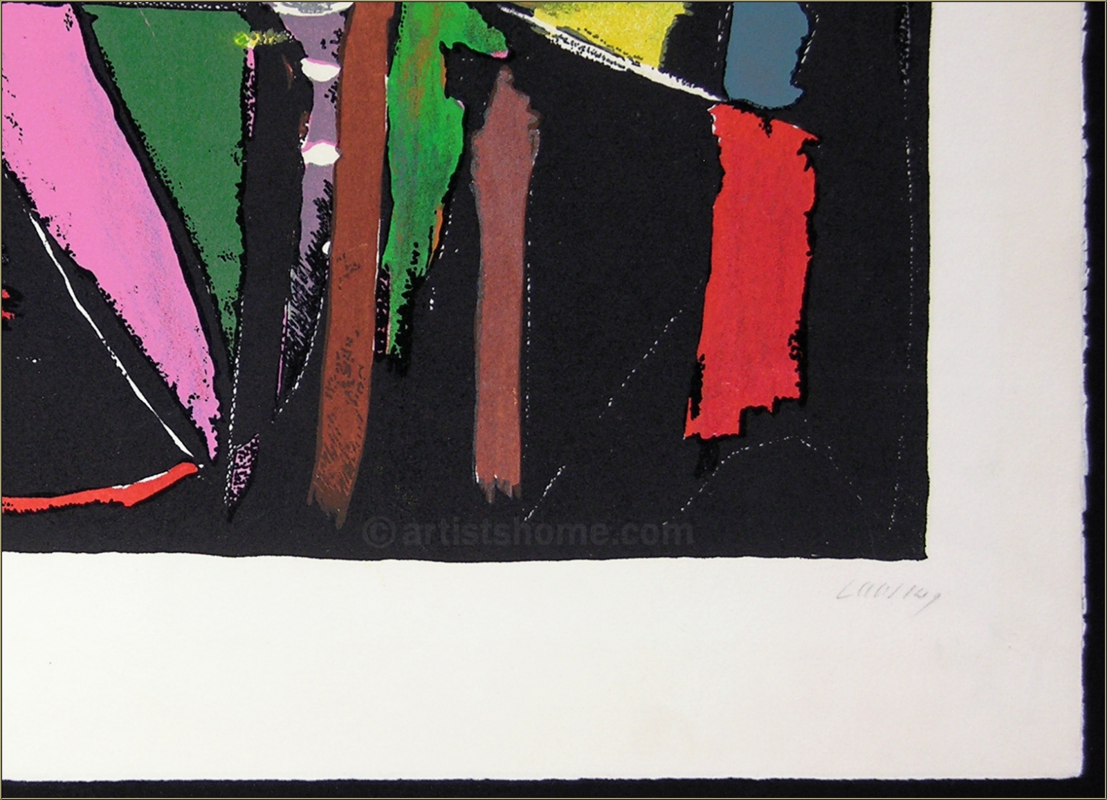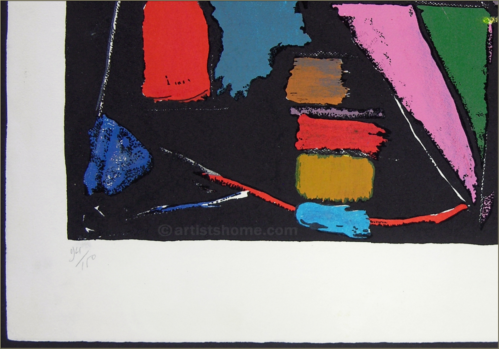 Details:Abstrakte Komposition in 12 Farben auf schwarzem Grund Dieses Blatt strahlt, trotz der unglaublich hohen Anzahl an verwendeten Farben, eine wohltuende Harmonie aus, befriedet durch den schwarzen Hintergrund. Eine dominante, unruhige Rahmung verbietet sich von selbst, wir empfehlen deshalb eine schlichte schwarze oder silberfarbene Leiste.