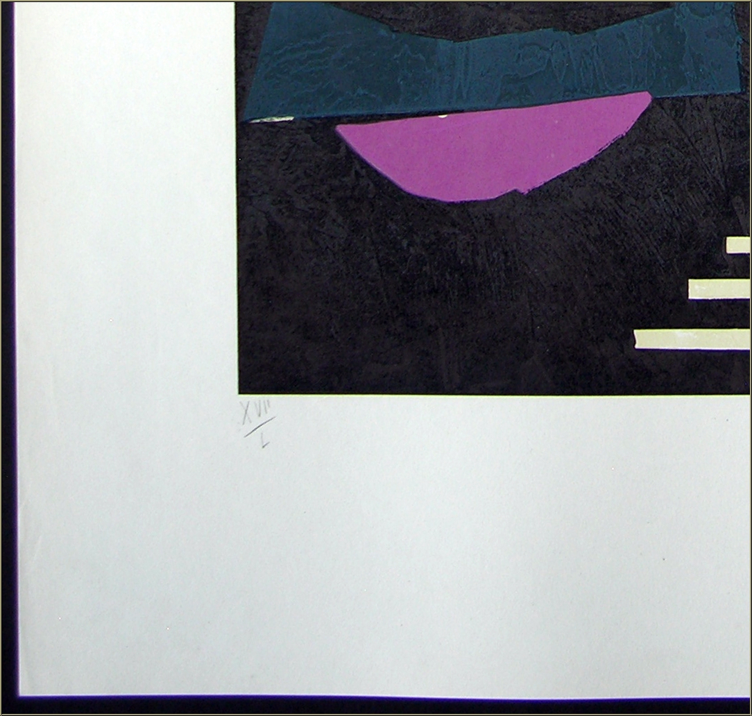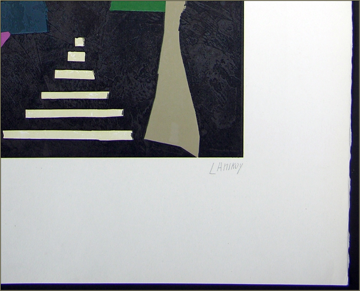 Details:Figuren auf schwarzem Grund, 1973 Abstrakte Gestalten als Lanskoy-typische Collage, aufwändig vom Künstler als Farblithographie mit einer bildschönen Struktur gearbeitet. Die imposante Größe des Blattes betont die kraftvolle Aussage des für Lanskoys Verhältnisse ungewöhnlich spartanisch gehaltenen Motivs. Hier einer von nur 50 römisch nummerierten und in Bleistift signierten Abzüge auf Fabriano Büttenpapier.