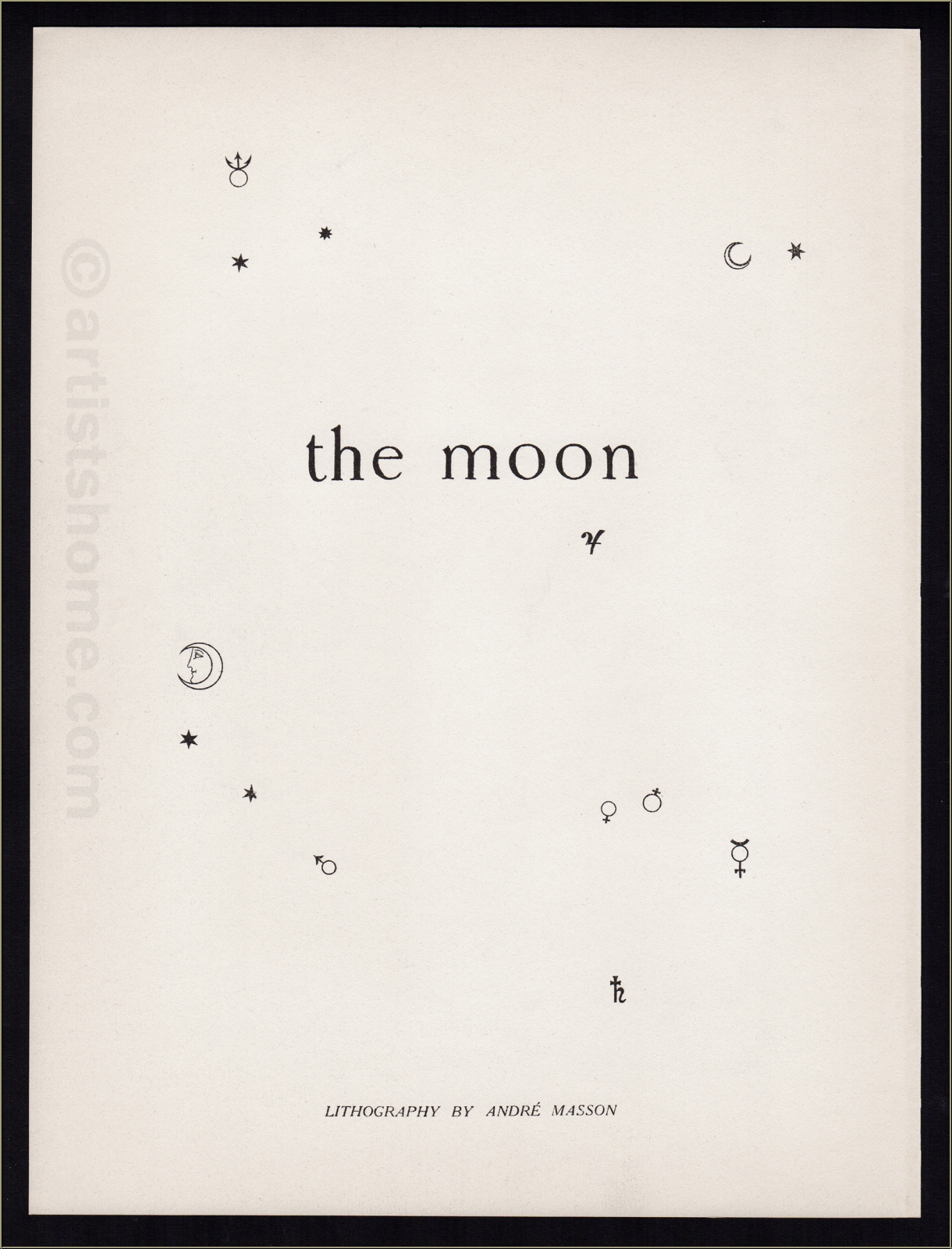 Details:"Der Mond" - The Moon / Lune - 1938 Ein - wie es scheint - schneebedeckter und behörnter Mond, in dessen "Auge" sich mindestens ein weiterer Himmelskörper zu spiegeln scheint. Vermutlich handelt es sich dabei um unsere Erde, wie die gewählten Farben Blau und Gelb nahe legen. Die Interpretation der übrigen hier inszenierten Elemente ist so schwierig wie müßig, denn in der Kunst des Surrealismus und insbesondere der "traumhaften" Verformung und Übersteigerung der Realität war Masson ein wahrer Meister. Für die zweite, 1938 in Frankreich, den USA und Großbritannien herausgegebene Ausgabe des avantgardistischen Kunstmagazins Verve bat der Verleger Tériade die Maler Wassily Kandinsky und André Masson um ihre künstlerische Mitwirkung zu dem Leitthema dieser Heftnummer - den Himmelskörpern. Masson steuerte neben dem hier angebotenen "Mond" eine weitere Arbeit bei: die "Sonne" (separat erhältlich).