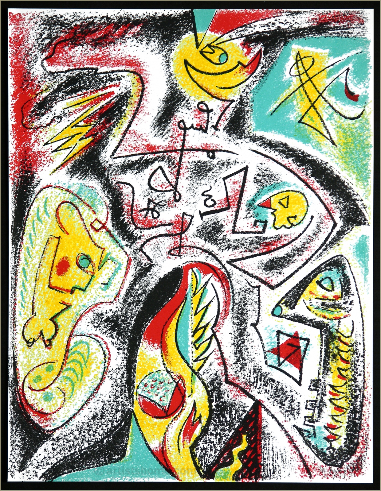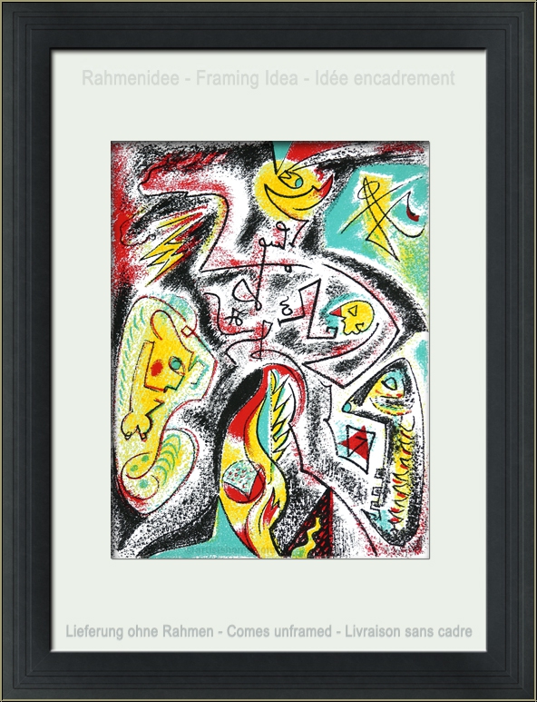 Details:Turbulenzen Farbenprächtige surrealistische Bildkomposition mit mystischen Symbolen und abstrakten Figuren, die der Künstler 1969 für den Kunstband "Panorama '69" als Lithographie zeichnete.