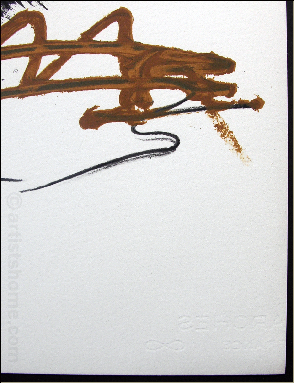 Neben der unsignierten Auflage auf Velin für Derriere le miroir wurden 150 Exemplare auf Arches Bütten mit breitem Rand gedruckt und von Tàpies signiert. Um ein solches - allerdings unsigniertes - Exemplar handelt es sich hier. Die Ränder sind leicht beschnitten (s. Foto). Selten!