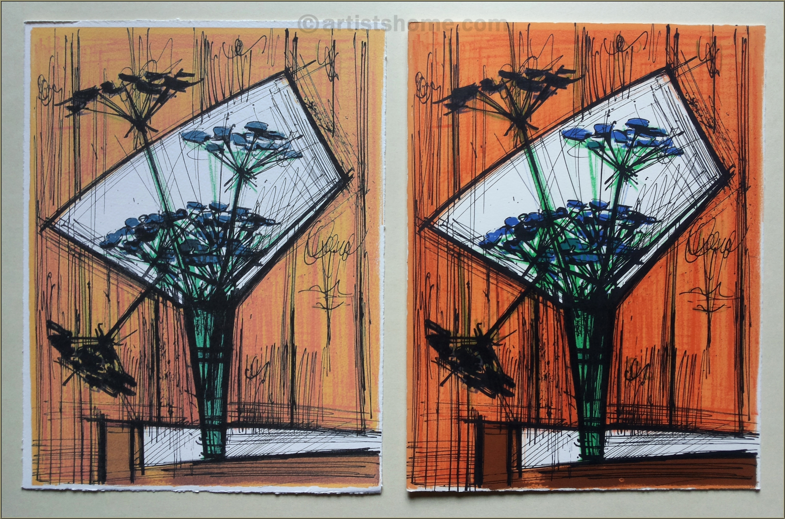 Prächtige Original-Farblithographie mit blauen Wiesenblumen in einer schlichten Vase vor orangefarbenem Hintergrund, gedruckt auf kräftigem Arches Bütten. Von Bernard Buffet für die Vorzugsausgabe von Fernand Mourlots Portfolio "Souvenirs et portraits d'artistes" als Steindruck gearbeitet.