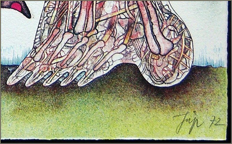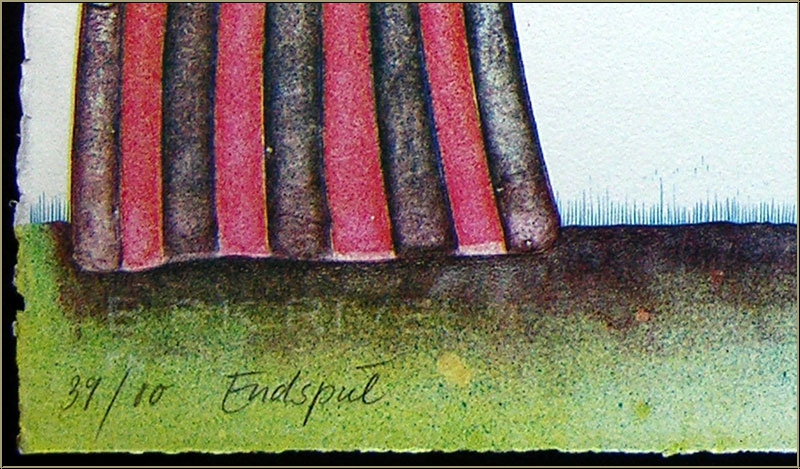 | | "Endspiel" - 1972 Original-Farblithographie, typische Arbeit aus Jägers "Menschenzoo mit allerlei Getier", das sowohl Kleider als auch Haut abgelegt hat und dem Betrachter nun sein Innenleben präsentiert. | Jahr: | 1972 | | Größe: | 50 x 65 cm (Blatt) | | Auflage | Papier: | Eines von 60 signierten, datierten, betitelten und nummerierten oder bezeichneten Exemplaren auf BFK Rives Bütten | | Verleger: | Edition Brusberg, Hannover | | Druck: | Bernhard Jäger | | Anmerkungen: | Für Bernhard Jäger hatte die Druckgrafik stets die gleiche Wichtigkeit wie seine Malerei und Zeichnungen, sie bedingten sich sogar wechselseitig in seinem künstlerischem Wachstum. Als Perfektionist und Vollbluthandwerker wiederum war nicht nur der Prozess des Lithografierens für ihn von Bedeutung, sondern auch der komplexe Druckvorgang.So gründete er schon früh (1961) zusammen mit Thomas Bayrle eine eigene Druckwerkstatt, die Gulliver-Presse, und druckte fast seine gesamte Grafik selbst. | Werkverzeichnis/ Referenz: | Roh, Juliane. Deutsche Kunst seit 1960 - Druckgraphik. Bruckmann, München, 1974, Seiten 29 und 195-196 (Werkliste) Brusberg Berichte 16, Editionskatalog. Galerie Brusberg, Hannover, 1973, Seite 85 | | Zustand: | Erläuterungen hierzu Tadelloses Exemplar aus dem Archiv! | Kundenbewertungen Bisher wurde noch keine Bewertung abgegeben. Bewertungen können nur von Kunden geschrieben werden, die den Artikel gekauft haben und eingeloggt sind. Ihre persönlichen Daten werden automatisch anonymisiert (Beispiel: "Jens H., Deutschland").  *Gültig für Lieferungen nach Deutschland bei Zahlung per PayPal. Bei Zahlung per Banküberweisung verlängert sich die Lieferzeit um 1-3 Tage ab dem Tag, an dem Sie überwiesen haben. Lieferzeiten für andere Länder sowie Informationen zur Berechnung des Liefertermins finden Sie hier |