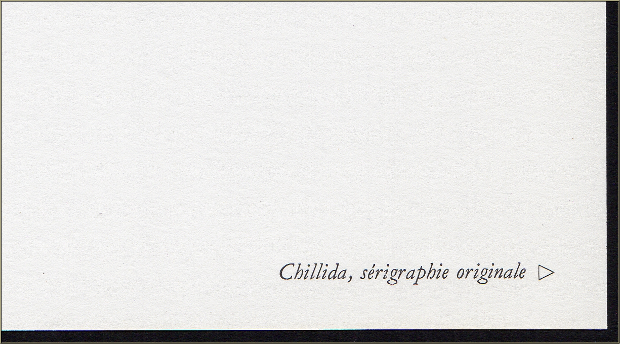 | | Original-Serigraphie (Siebdruck) von Eduardo Chillida aus dem obigen Portfolio, das 1982 anläßlich des Todes des bekannten französischen Verlegerpaares Maeght (1981 starb Aimé Maeght, 4 Jahre nach seiner Frau) von 24 "seiner" Künstler mit Originalgrafik ausgestattet wurde. | | Papier: | Ein herrlich samtiger Siebdruck auf glattem Vélinkarton | | Signiert: | im Sieb monogrammiert | | Verleger: | Galerie Maeght, Paris, 1982 | | Anmerkungen: | Rückseitig typographisch bedruckt, wie erschienen. Der gezeigte Titel "Chillida, sérigraphie originale" steht auf der vorhergehenden Seite, von der Ihnen eine Kopie mitgeliefert wird. | Werkverzeichnis/ Referenz: | Maeght Éditeur. Derriere le miroir 1946-1982. Maeght, Paris, 1983, S. 110 | | Dieses Blatt wird durch unseren Geschenk-Service verpackt Kundenbewertungen Bisher wurde noch keine Bewertung abgegeben. Bewertungen können nur von Kunden geschrieben werden, die den Artikel gekauft haben und eingeloggt sind. Ihre persönlichen Daten werden automatisch anonymisiert (Beispiel: "Jens H., Deutschland").  *Gültig für Lieferungen nach Deutschland bei Zahlung per PayPal. Bei Zahlung per Banküberweisung verlängert sich die Lieferzeit um 1-3 Tage ab dem Tag, an dem Sie überwiesen haben. Lieferzeiten für andere Länder sowie Informationen zur Berechnung des Liefertermins finden Sie hier |