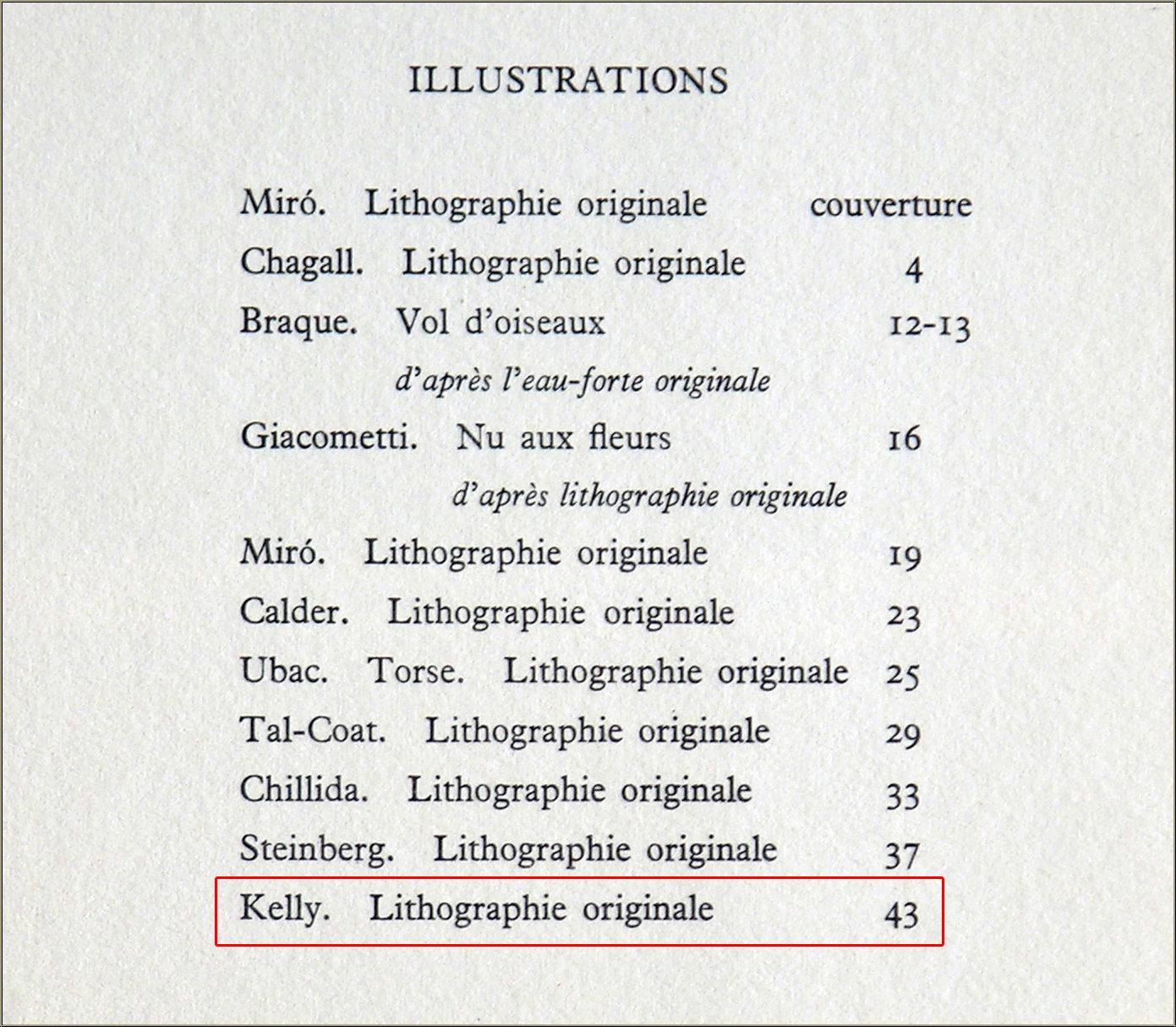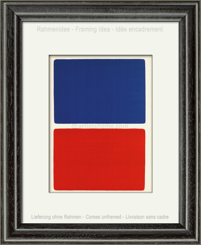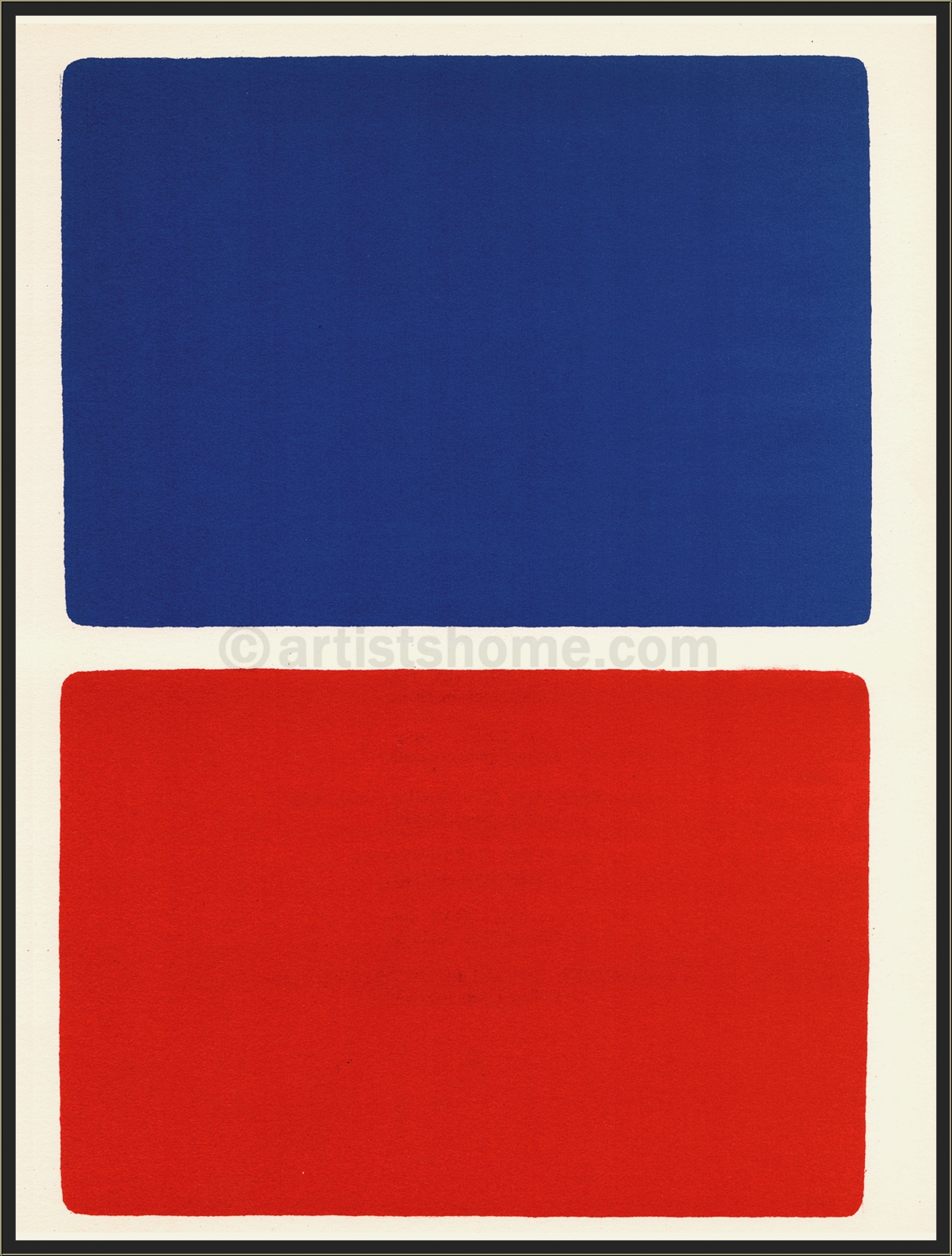 Details:Rechtecke Blau über Rot (Komposition für Maeght und Redfern) Ein blaues Rechteck oben und ein rotes darunter, beide mit "curved edges" und auf weißen Hintergrund gestellt. Dieses geometrische Abstraktion war der Beitrag Ellsworth Kellys zu einem aufwändig hergestellten Ausstellungskatalog, der zusammen mit Arbeiten weiterer bekannter Künstler unter dem Titel "Graphik, Lithographien und illustrierte Originalbücher des Maeght-Verlags" von der Redfern-Galerie in London herausgegeben wurde. Heute sind diese Originaldrucke wegen ihrer Seltenheit gesuchte Sammlerstücke.