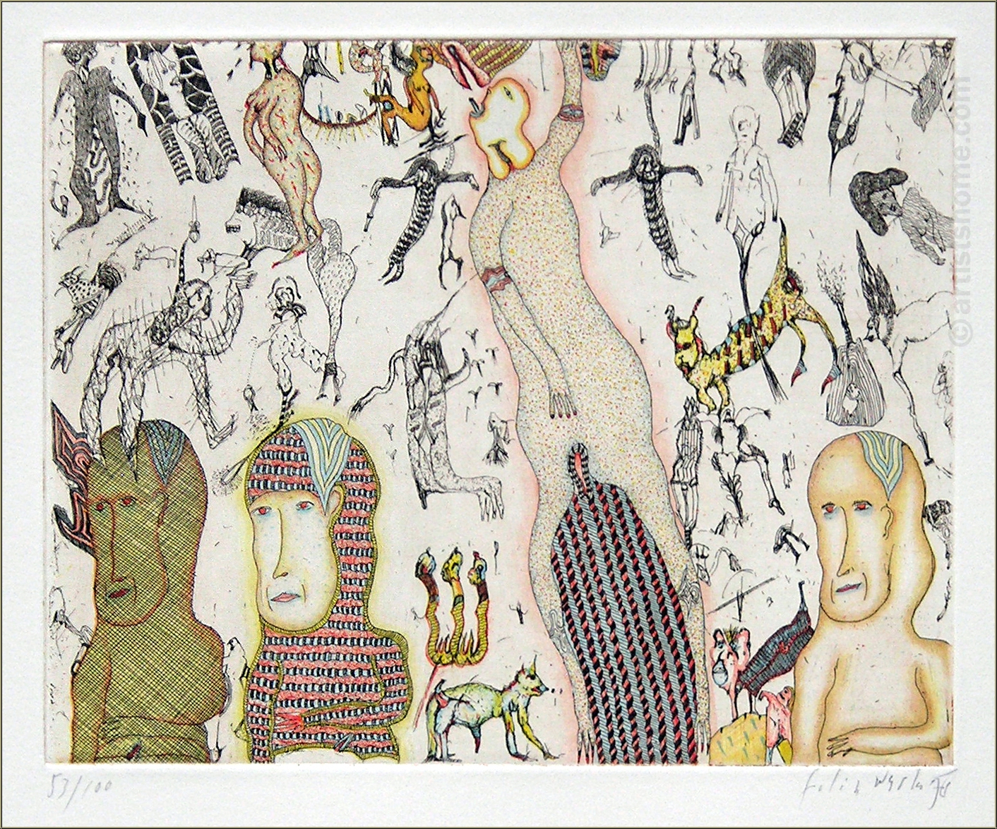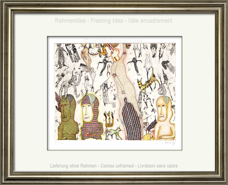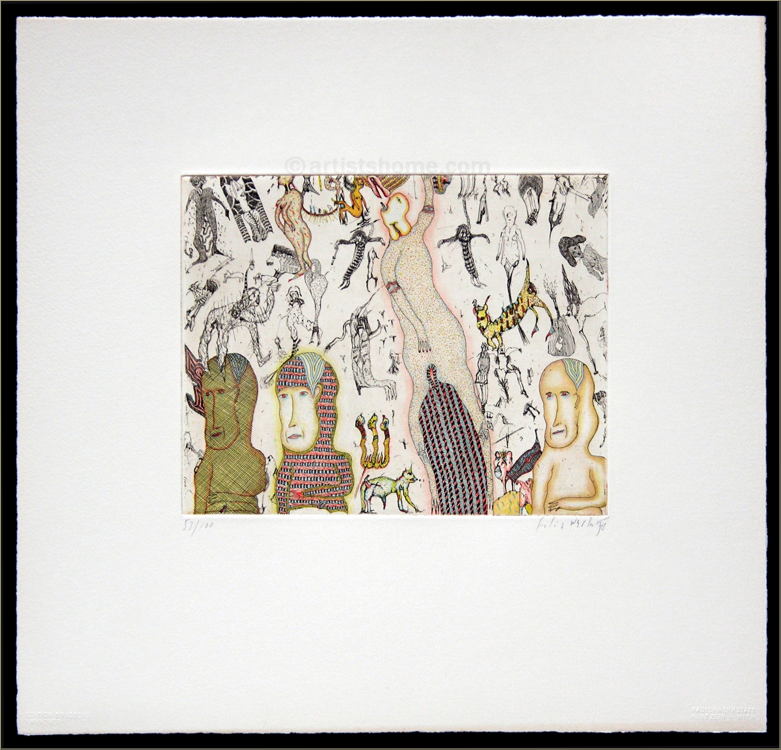 Details:"Journey to Soul" (Reise ins Innere) - 8 - Die 3. Person Augenzwinkernde Radierung des Österreichers zum Thema 'Liebesleben usw.' für 'Kupferne Erzählungen' von 1978. Auf kräftigem Arches Bütten, signiert, datiert und nummeriert, eines von 100 Exemplaren. Die perfekte Geschenkidee für Paare, bei denen es turbulent zugeht.