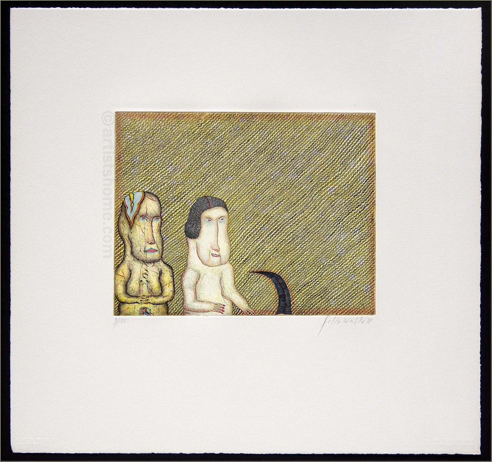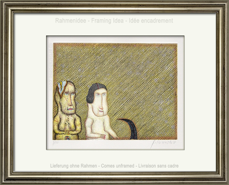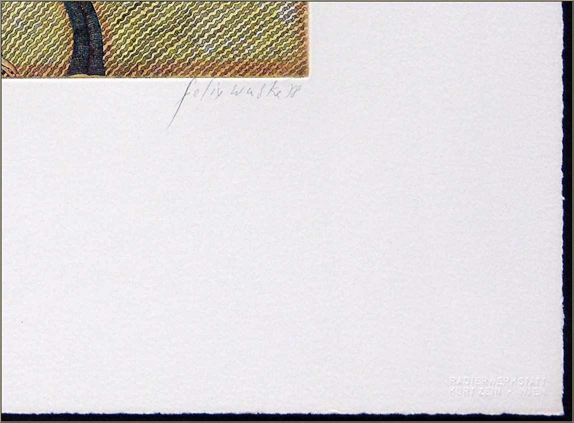 Details:"Journey to Soul" (Reise ins Innere) - 3 - Stilles Glück Genial-delikate Arbeit Waskes aus seinem Radierzyklus 'Kupferne Erzählungen' zum Thema "Die Ruhe vor dem Sturm" für 'Kupferne Erzählungen' von 1978. Auf kräftigem Arches Bütten, signiert, datiert und nummeriert, eines von 100 Exemplaren. Eine charmante Geschenkidee für sturmerprobte Paare.