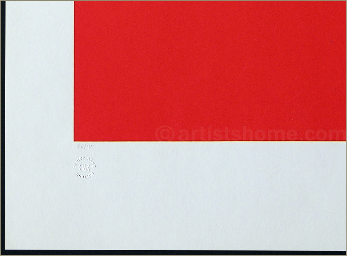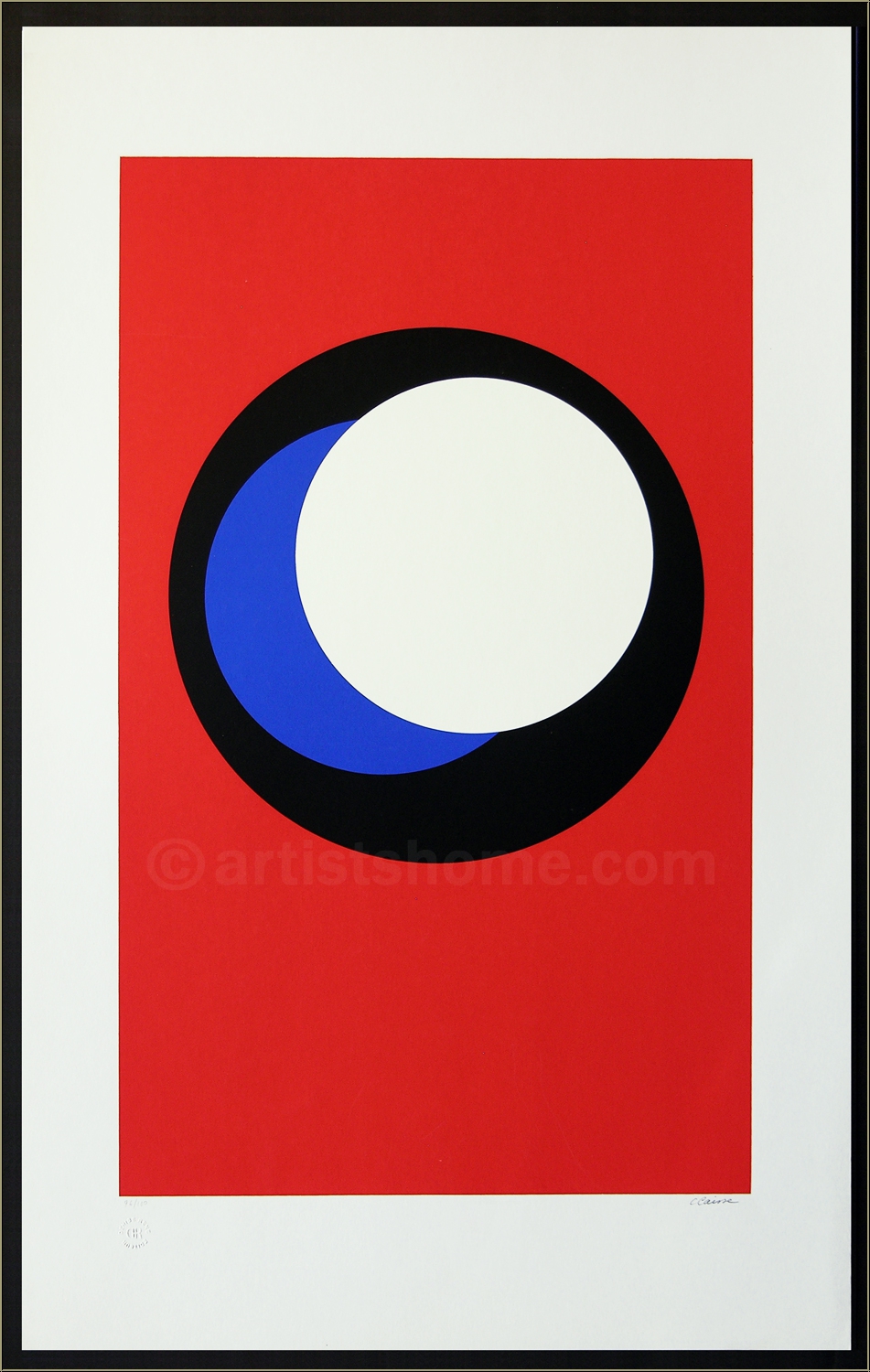 Details:"Cercles" - Signalrote Fläche mit schwarzen, blauen u. weißen Kreisen Konstruktivismus mit dem Kreis als grundlegender geometrischer Form. Für diese Originalgrafik hat Geneviève Claisse je eine schwarze, blaue und schließlich weiße Kreisfläche übereinander gelegt und auf kräftiges Rot gestellt. Sie erinnert damit an die 70er Jahre mit ihrem Space Age-, Panton- und POP Art-Design und darf sich zweifellos zu den Klassischen Modernen der abstrakten Kunst zählen. Handsigniertes, schönes Exemplar dieser empfindlichen Grafik!