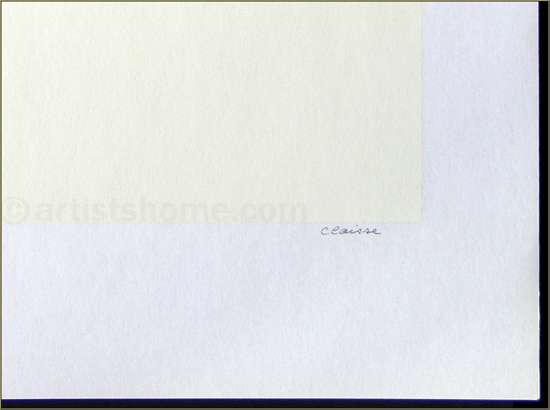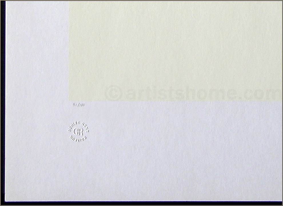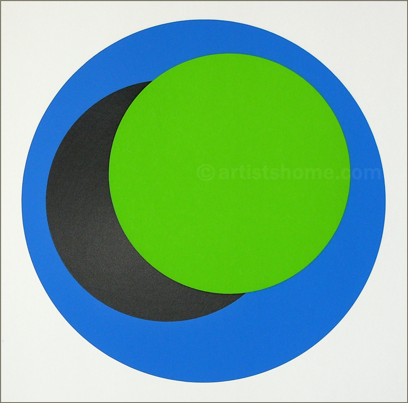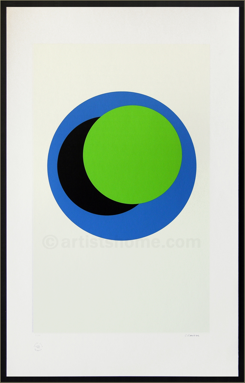 Details:"Cercles" - Weiße Fläche mit Kreisen in Blau, Grün und Schwarz Konstruktivismus mit dem Kreis als grundlegender geometrischer Form. Für diese Originalgrafik hat Geneviève Claisse je eine schwarze, grüne und blaue Kreisfläche übereinander gelegt und auf gedecktes Weiß gestellt. Sie erinnert damit an die 70er Jahre mit ihrem Space Age-, Panton- und POP Art-Design und darf sich zweifellos zu den Klassischen Modernen der abstrakten Kunst zählen. Handsigniertes Exemplar in nahezu makellosem Zustand!