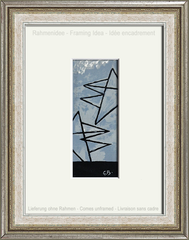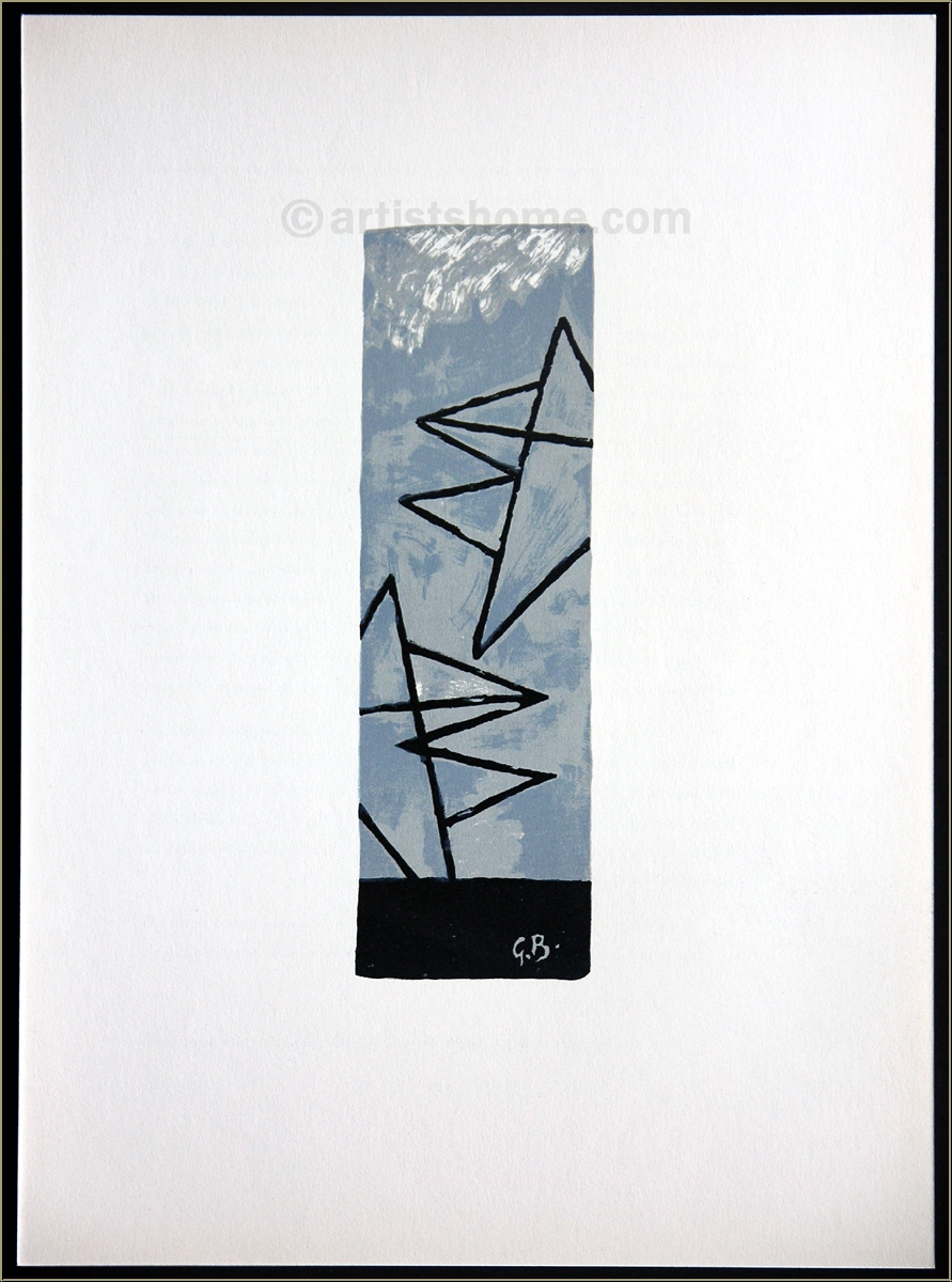 Anmerkungen: *Diese Grafik ist zwar keine Original-Lithographie von Georges Braque, sondern wurde 1959 nach einem seiner Gemälde von einem der Lithographen in der Druckerei Mourlot angefertigt, die auch sonst für Braque arbeitete (vermutlich von Henri Deschamps). Dennoch ist sie alles andere als ein Kunstdruck.