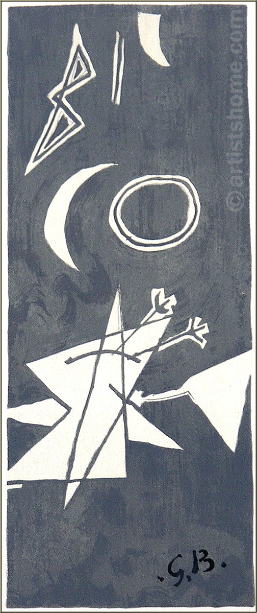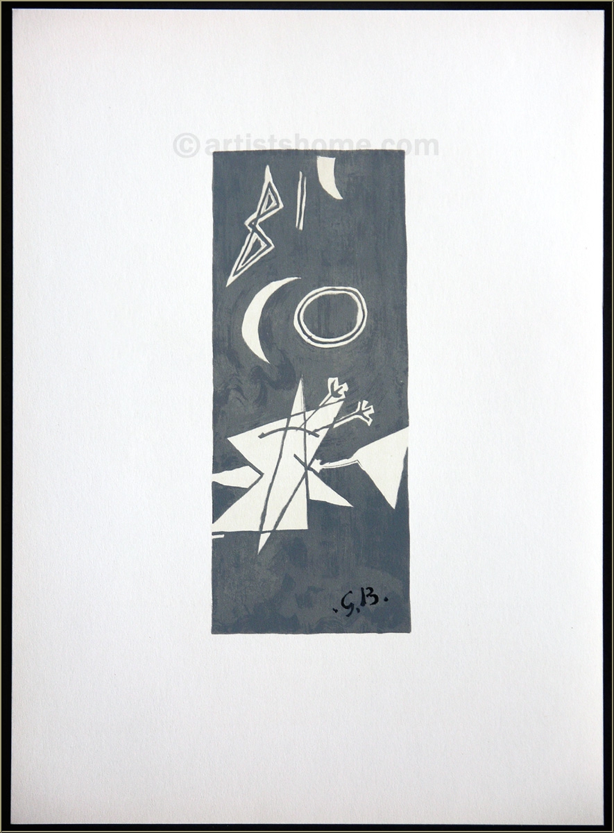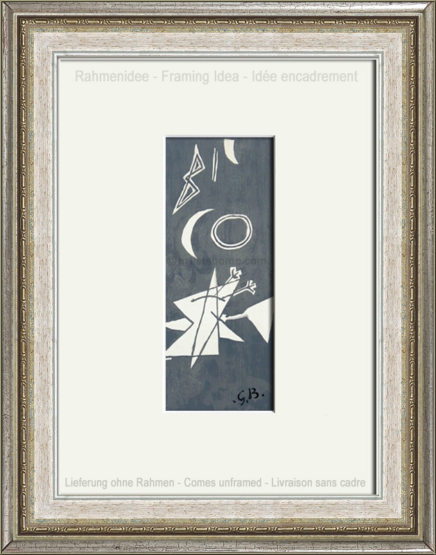 Anmerkungen: *Diese Grafik ist zwar keine Original-Lithographie von Georges Braque, sondern wurde 1959 nach einem seiner Gemälde von einem der Lithographen in der Druckerei Mourlot angefertigt, die auch sonst für Braque arbeitete (vermutlich von Henri Deschamps). Dennoch ist sie alles andere als ein Kunstdruck.