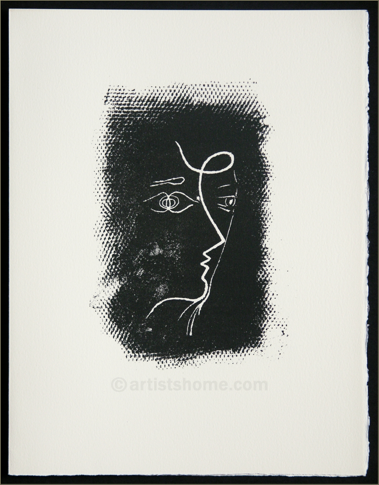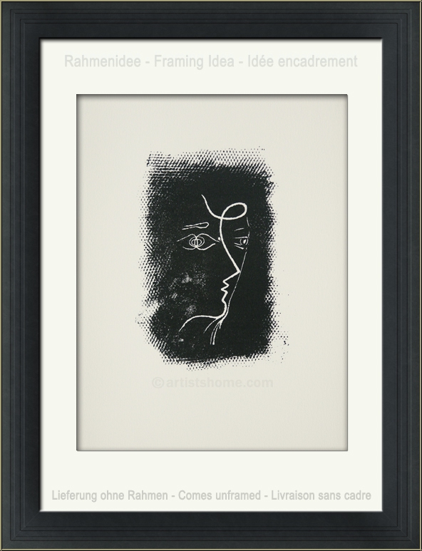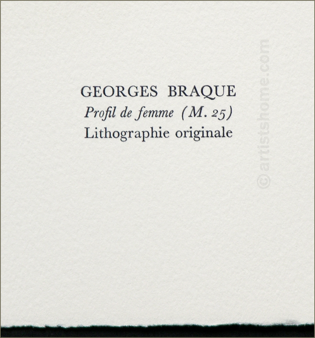 Details:"Profil de femme" (Profil einer Frau) Diese schlichte, in einfarbig Schwarz gehaltene Portraitskizze war der Beitrag Braques zu einem aufwändig illustrierten Portfolio, mit dem der Meisterdrucker und -lithograph Fernand Mourlot seiner langjährigen Zusammenarbeit mit den ganz Großen der bildenden Kunst aus der Ecole de Paris gedachte. Einige von ihnen, darunter Braque, Matisse, Villon und Giacometti, lebten 1972 bereits nicht mehr, andere - wie Picasso - starben kurz darauf. Souvenirs et portraits d'artistes gilt deshalb als Vermächtnis des begnadeten Handwerkers und Verlegers. Georges Braque arbeitete dieses Motiv bereits im Jahr 1955. Im Werkverzeichnis von Mourlot ist dazu folgendes vermerkt: "Cette lithographie en noir est réservée à un ouvrage à pareitre" ("Diese Lithographie in Schwarz ist für ein in Kürze erscheinendes Buch reserviert"). Die Erlaubnis zum späteren Druck als Original-Lithographien erhielt Fernand Mourlot von den 1972 längst verstorbenen Künstlern Braque, Cocteau, Derain, Giacometti und Villon noch zu deren Lebzeiten, als er viele Jahre zuvor bereits ein "Buch der Freundschaft" plante mit dem Titel "Adieu à la rue de Chabrol", dem früheren Firmensitz des Ateliers Mourlot. Dieses Werk wurde jedoch nie realisiert. Die Freigabe zum Druck der posthum zum ersten Mal veröffentlichten Original-Lithographie von Matisse erhielt Fernand Mourlot 1972 von Marguerite Duthuit-Matisse, der Tochter des Künstlers.