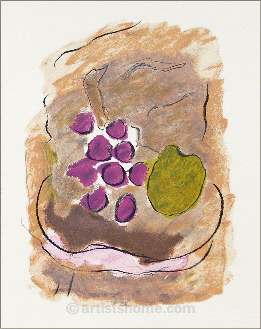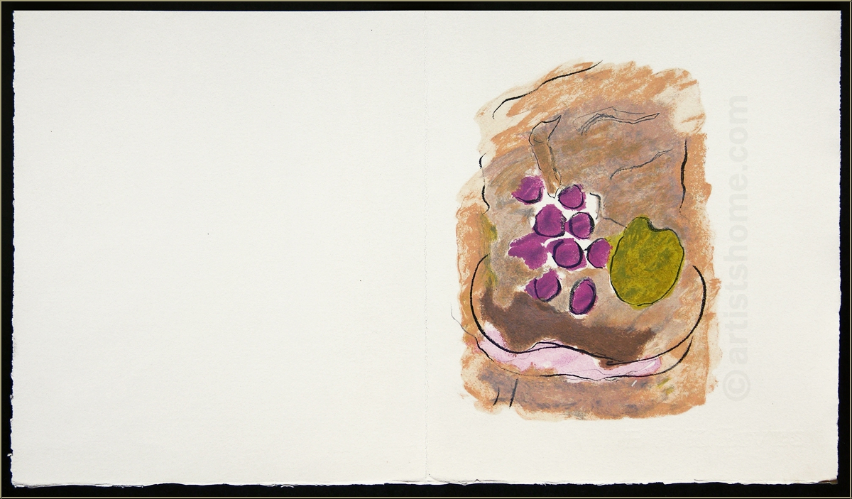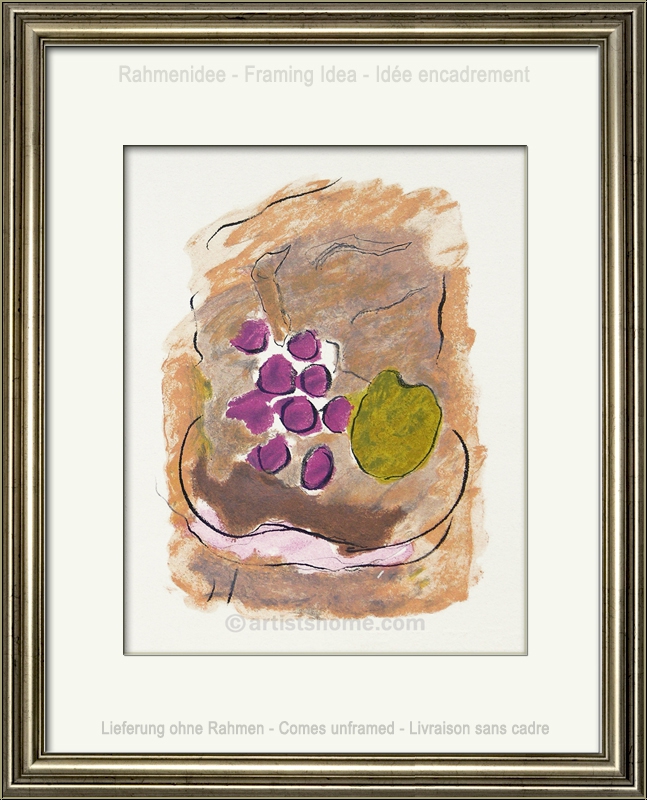 Details:"Nature morte" - Stillleben mit Früchten, 1962 Dieses besonders anmutig gezeichnete Stillleben war der Beitrag Braques für die aufwändig gemachte Festschrift zur Hundertjahrfeier der Kronenhalle in Zürich. Die harmonische Farbgebung greift die gediegenen Brauntöne des Interieurs im ehrwürdigen Restaurant Kronenhalle auf, das damals neben Georges Braque auch Marc Chagall, Joan Miró und Alberto Giacometti zu seinen künstlerischen Gratulanten zählen durfte.