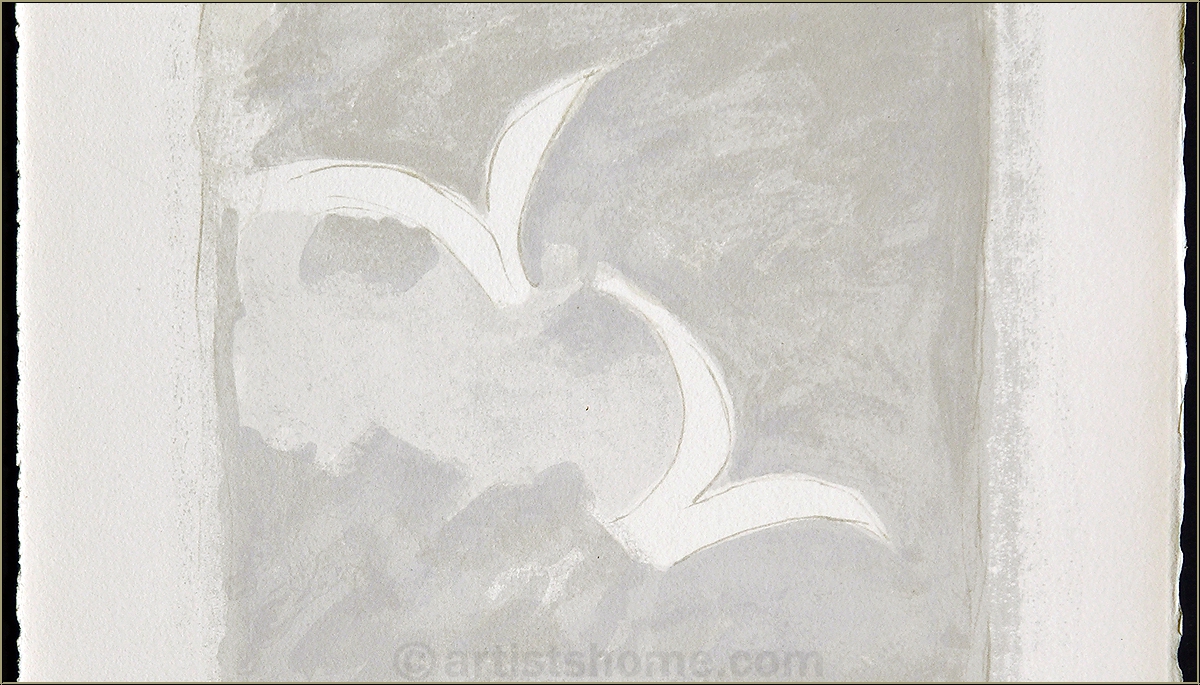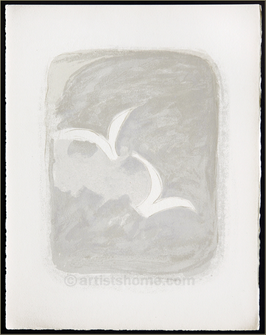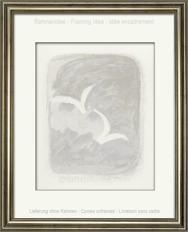 Details:Original-Lithographie für "Descente aux enfers" (Abstieg zur Hölle) Einen Hauch von Nichts in drei verschiedenen Grautönen hat der große Braque als Eröffnungsmotiv für den "Höllenritt" des Autors Marcel Jouhandeau gearbeitet. Ein fliegendes Vogelpaar, das aus fernen Nebeln aufzutauchen scheint... froh, endlich wieder Sicht auf die Dinge unter ihnen zu haben. Zart und filigran wirkt diese Grafik, durch ihre "unbunte" Farbgebung nur umso ausdrucksstärker. Dies ist die erste von vier Original-Farblithographien, mit denen Georges Braque eines seiner letzten Künstlerbücher (Titel s.o.) illustrierte. Alle vier Grafiken zeigen fliegende Vögel - ein Sujet, das ihm gegen Ende seines Lebens so wichtig wurde, dass er es in unzähligen Variationen immer wieder neu erfand.