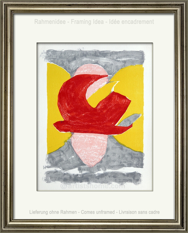 | | Original-Lithographie für "Descente aux enfers - Abstieg zur Hölle" Grand oiseau rouge - Blatt IV der Folge (von IV) Dies ist die vierte von vier Original-Farblithographien, mit denen Georges Braque eines seiner letzten Künstlerbücher (Autor: Marcel Jouhandeau, "Descente aux enfers") illustrierte. Alle vier Steindrucke zeigen fliegende Vögel - ein Sujet, das Braque gegen Ende seines Lebens so wichtig wurde, dass er es in unzähligen Variationen immer wieder neu zeichnete. | Technik: | Original-Farblithographie (Mourlot 80, Vallier 171) Hinweis: Dies ist KEIN Kunstdruck, sondern die Original-Lithographie (Steindruck) von Georges Braque, wie sie exakt so auch im Werkkatalog verzeichnet ist! | | Jahr: | 1961 | | Größe: | 32 x 25 cm (Blattgröße) | | Auflage | Papier: | Probedruck auf Vergé de Montval-Bütten vor der Auflage von 'einigen Suiten' (so das Werkverzeichnis). Für die Buchauflage wurden 200 Exemplare auf Rives-Bütten abgezogen. Unsigniert. Ausgesprochen selten! | | Verleger: | Nouveau Cercle parisien du Livre, Paris | | Druck: | Mourlot, Paris | Werkverzeichnis/ Referenz: | - Mourlot, F. Braque Lithographe, André Sauret, Monte-Carlo, 1963, S. 132-133, Nr. 80, mit Abb. - Vallier, Dora. Braque. Das graphische Gesamtwerk, Stuttgart, Klett-Cotta, 1982, S. 240, Nr. 171, mit. Abb. Sie erhalten mit der Lieferung den Auszug aus diesen Verzeichnissen, sowie zusätzlich einen Identitätsnachweis (ohne Preisangabe, falls das Blatt verschenkt werden soll). | | Zustand: | Erläuterungen hierzu Schönes, farbfrisches Exemplar aus dem Archiv. Lieferung ohne Rahmen. | Dieses Blatt wird durch unseren Geschenk-Service verpackt Kundenbewertungen Bisher wurde noch keine Bewertung abgegeben. Bewertungen können nur von Kunden geschrieben werden, die den Artikel gekauft haben und eingeloggt sind. Ihre persönlichen Daten werden automatisch anonymisiert (Beispiel: "Jens H., Deutschland").  *Gültig für Lieferungen nach Deutschland bei Zahlung per PayPal. Bei Zahlung per Banküberweisung verlängert sich die Lieferzeit um 1-3 Tage ab dem Tag, an dem Sie überwiesen haben. Lieferzeiten für andere Länder sowie Informationen zur Berechnung des Liefertermins finden Sie hier |