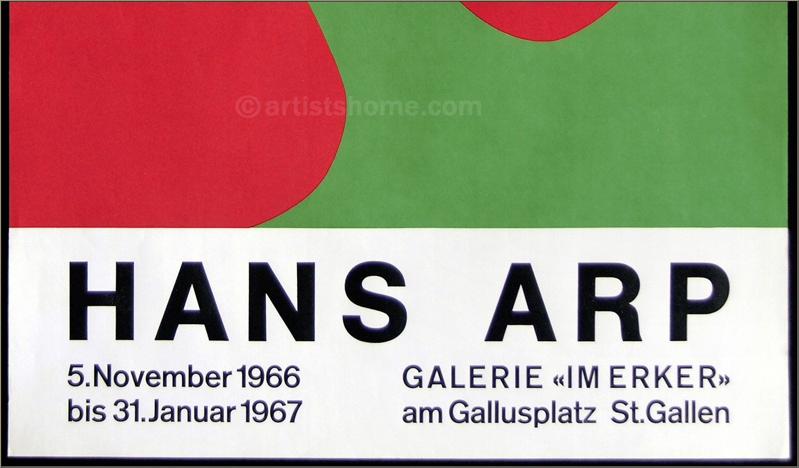 Details:Hans Arp - Galerie Im Erker (Form 1, Rot und Grün) Mit der dreiteiligen Plakatserie "Affiches St. Gallen" gedachte die Galerie im Erker im November 1966 dem wenige Monate zuvor verstorbenen Künstler. Hier das Motiv "Affiche St. Gallen II", für das eine rote Komposition auf grünem Grund von Hans Arp verwendet wurde. Es handelt sich hierbei um die vorletzte originalgrafische Arbeit Arps, die im maßgeblichen Werkverzeichnis (Arntz) aufgeführt ist.