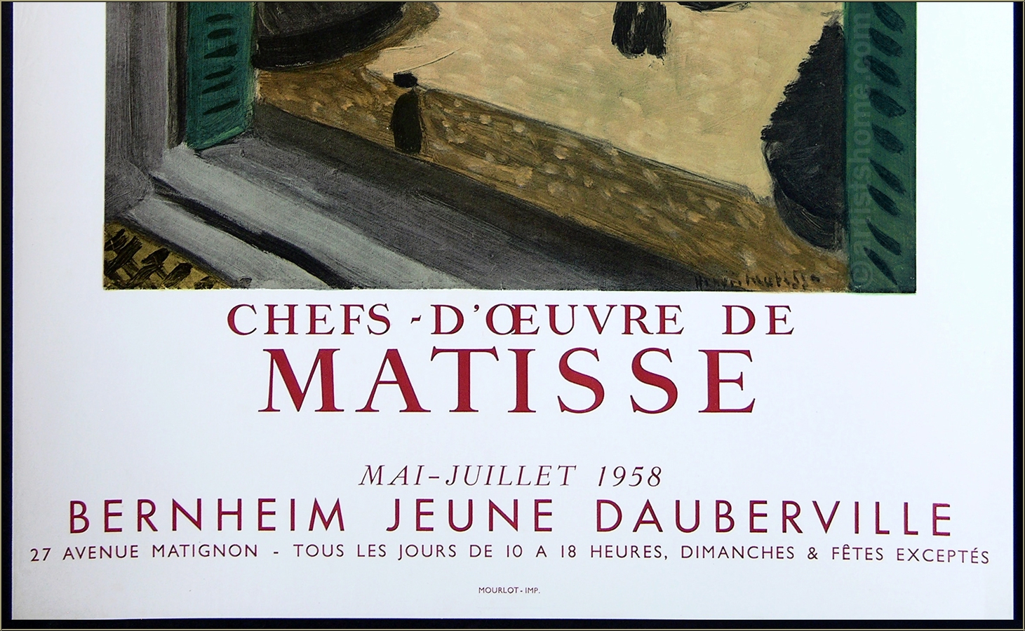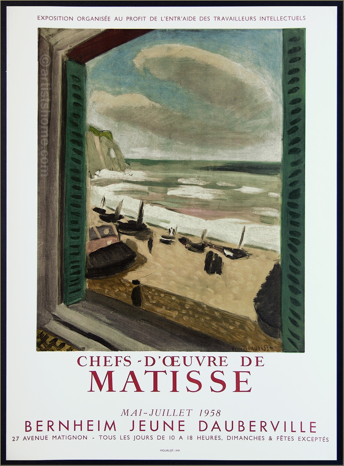 Details:Chefs-d'oeuvre de Matisse - Bernheim Jeune Dauberville Für dieses stimmungsvolle Ausstellungsplakat lithographierte Mourlot eines der frühen Meisterwerke von Matisse, den Blick aus dem "Fenster in Etretat" (Fenètre à Etretat) auf den winterlichen Strand des Fischerdorfes in der Normandie mit seinen Steilküsten und Fischerbooten.