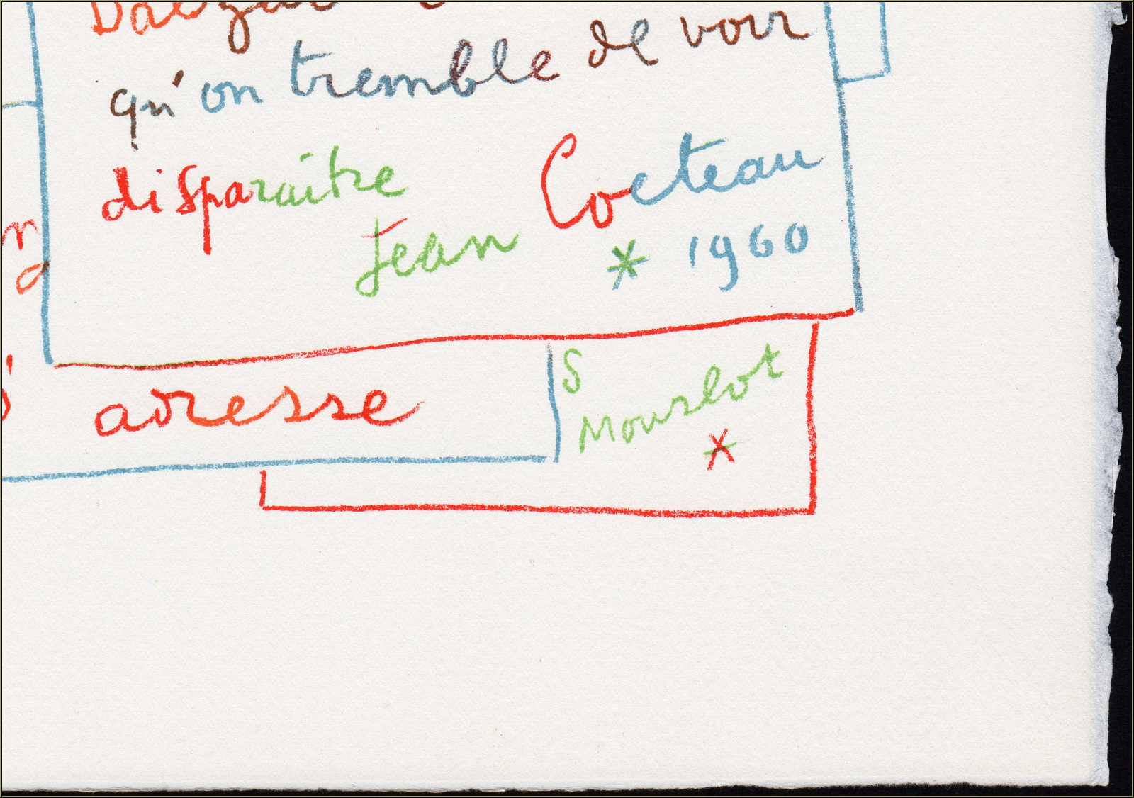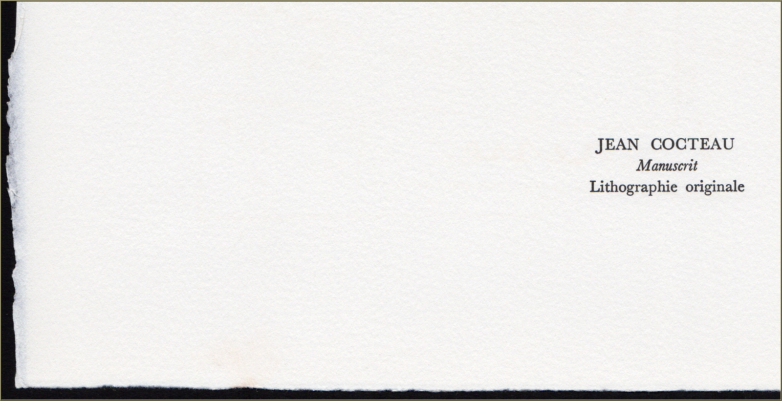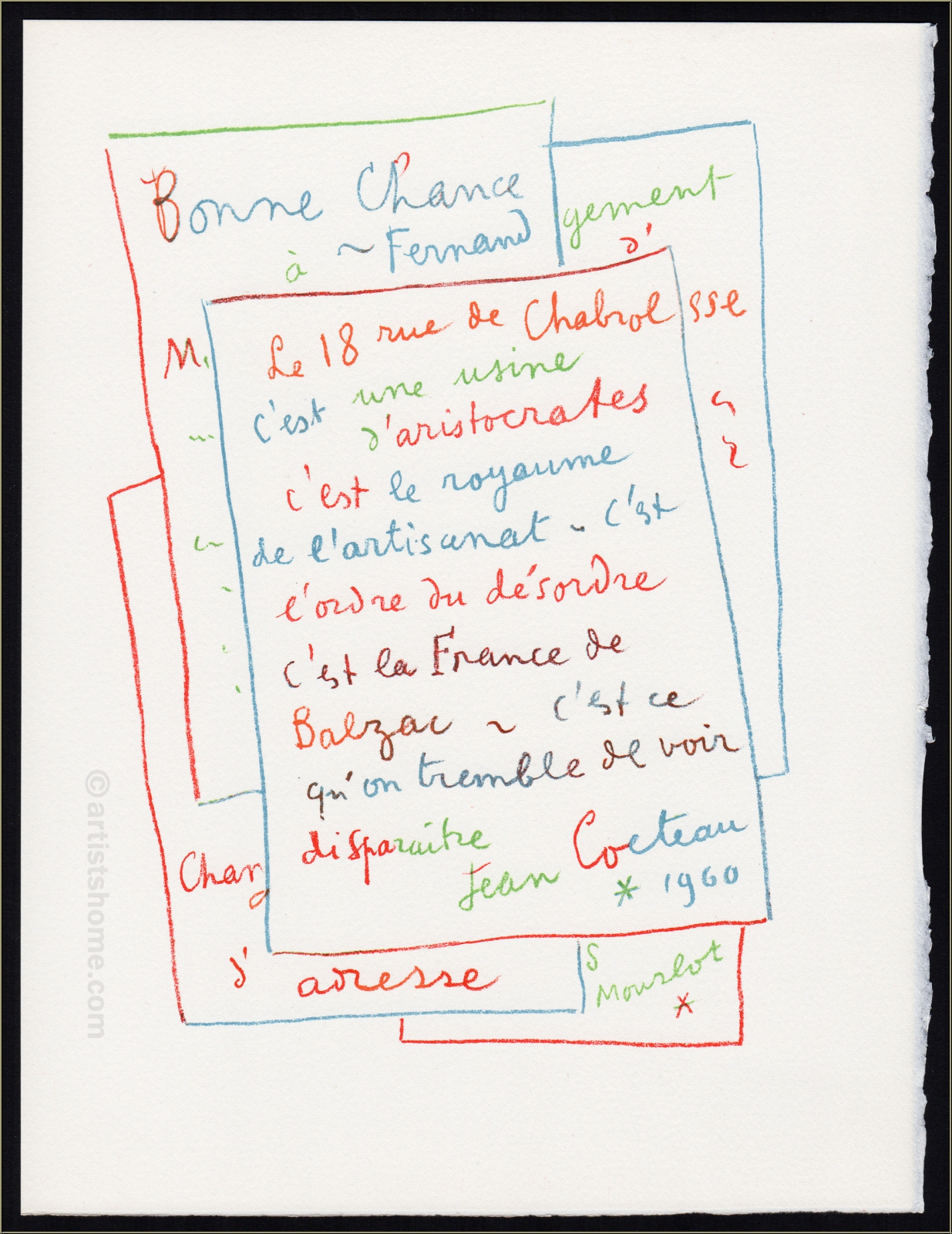 Details:"Manuscrit" Gemeinhin beherrscht ein Künstler entweder die Macht des Wortes, oder die der Farben und Bilder. Cocteau konnte auf unnachahmliche Weise beides, seine lyrischen Kompositionen ähneln nicht selten seinen malerischen, in ihrer oft nur silhouettenhaft angerissenen und doch immer pointierten Machart. Dieses lithographierte "Manuskript" hatte Cocteau 1960 ursprünglich für ein von Fernand Mourlot geplantes "Buch der Freundschaft" geschrieben und dann eigenhändig auf den Lithostein gezeichnet. Dieser Band, der unter dem Titel "Adieu à la rue de Chabrol" erscheinen sollte (dem früheren Firmensitz des Ateliers Mourlot), wurde jedoch nie realisiert bzw. erst viele Jahre später unter dem Titel "Souvenirs et portraits d'artistes". Für die hier angebotene Original-Lithograhie legte Cocteau auf einen kleinen imaginären Stapel beschriebener Blätter obenauf eine Grußnote an Fernand Mourlot. Es muss ihm zu dieser Zeit wichtig gewesen sein, seinem Freund und langjährigen handwerklichen Gefährten Glück zu wünschen, mit folgenden Worten: "Le 18 rue de chabrol c'est une usine d'aristocrates. C'est le royaume de l'artisanat - c'est l'ordre du désordre. C'est la France de Balzac - c'est ce que on tremble de voir disparaitre". Mit seinem letzten Satz, der sich fast wie ein tragischer Abschied liest, nimmt Cocteau Bezug auf den zu dieser Zeit geplanten Umzug der Druckerei von der rue de Chabrol in das 13. Arrondissement.
