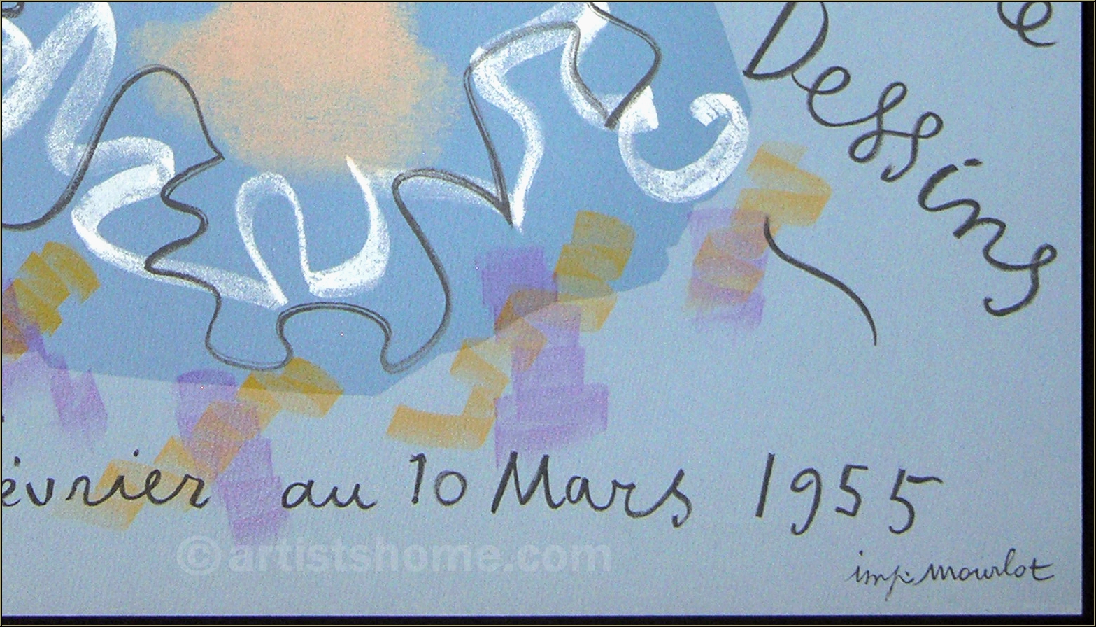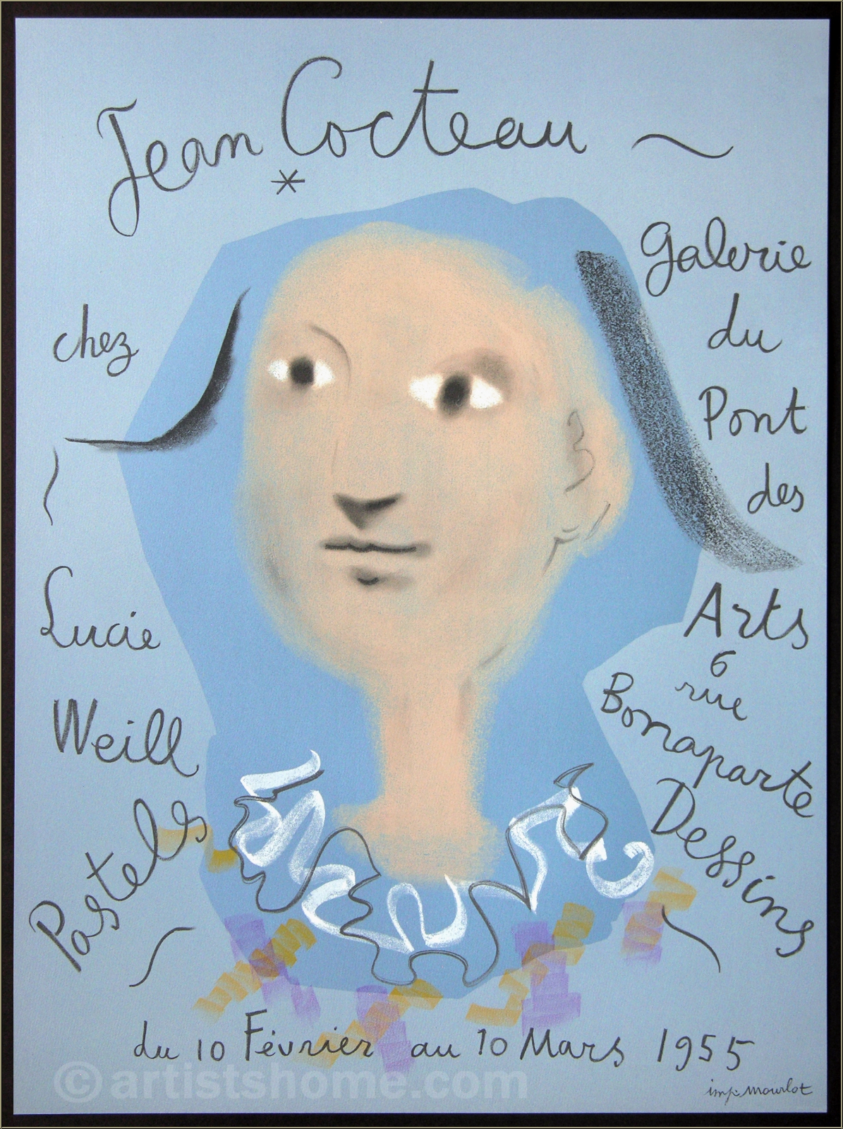 Details:"Jean Cocteau chez Lucie Weill - Pastels Dessins " Farblithographie "Arlequin sur fond bleu" für das Ausstellungsplakat der Galerie du Pont des Arts in Paris, 1955.