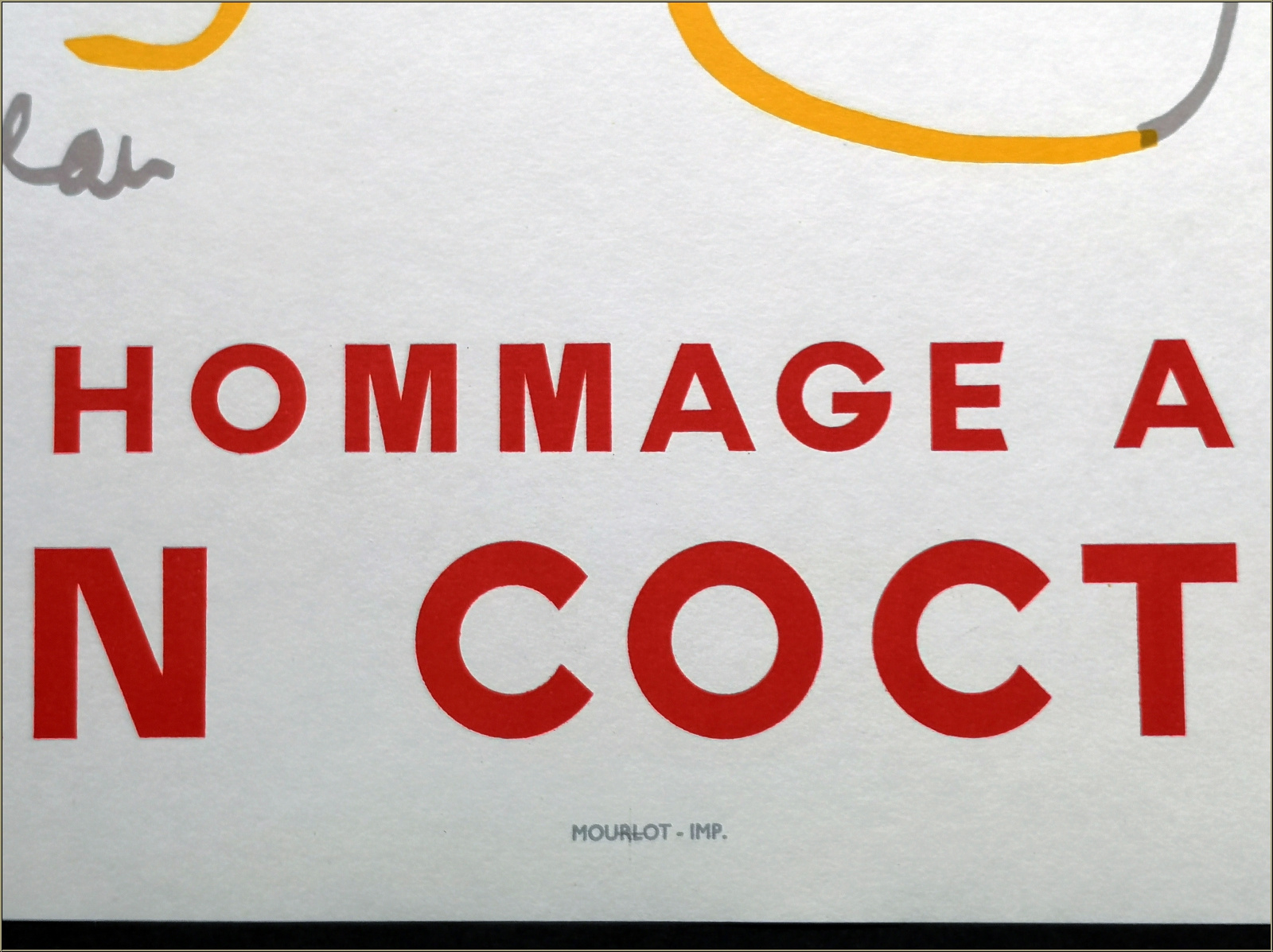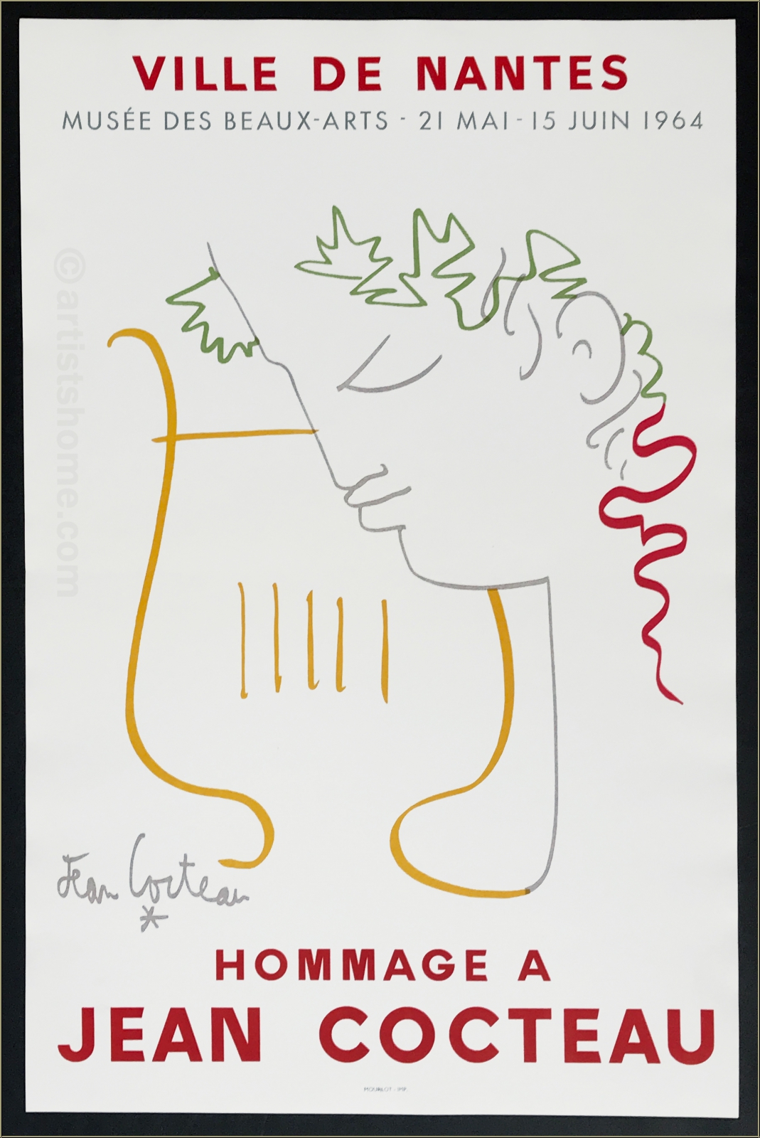 Details:Hommage à Jean Cocteau, Ville de Nantes, 1964 Wenige Monate nach dem Tod des Künstlers eröffnete das Musée des Beaux-Arts in Nantes seine Ausstellung zum Gedenken an Jean Cocteau. Für das Plakat wählte man ein Motiv aus dessen Orpheus-Oeuvre - den traurig dreinblickenden Orpheus mit seiner Lyra - dem Thema also, das Cocteau während seiner gesamten Karriere als Dichter, Filmemacher und Zeichner beschäftigte. Diese tragische Figur aus der griechischen Mythologie wie auch die emotionale Thematik der Unsterblichkeit der Seele waren gewiss geeignete "Platzhalter", um das Gesamtkunstwerk Cocteau gebührend zu würdigen.