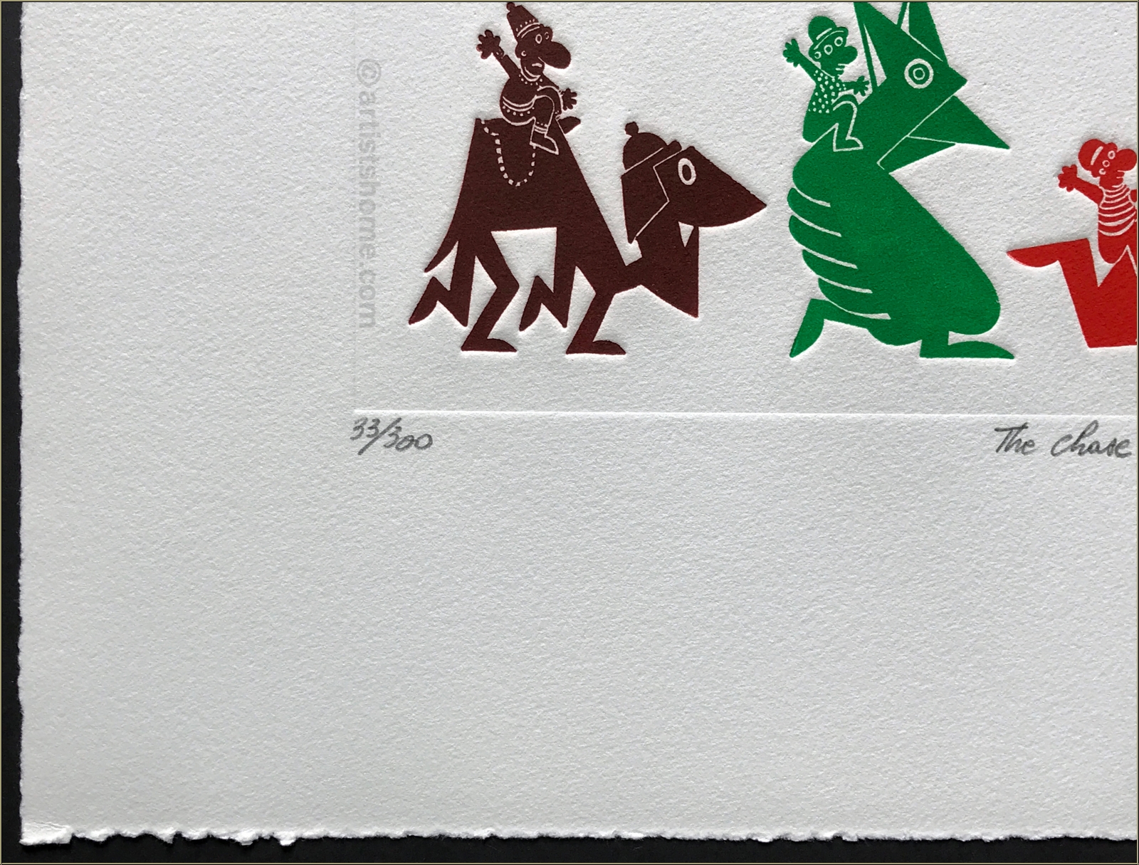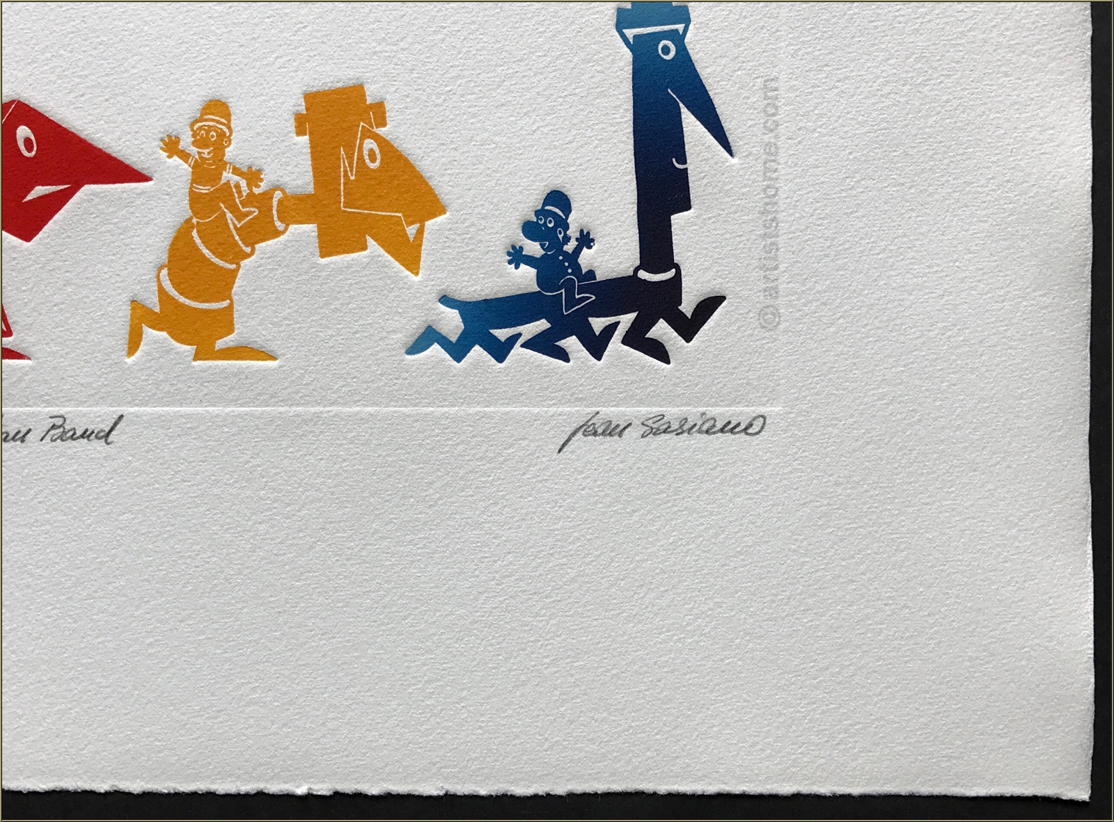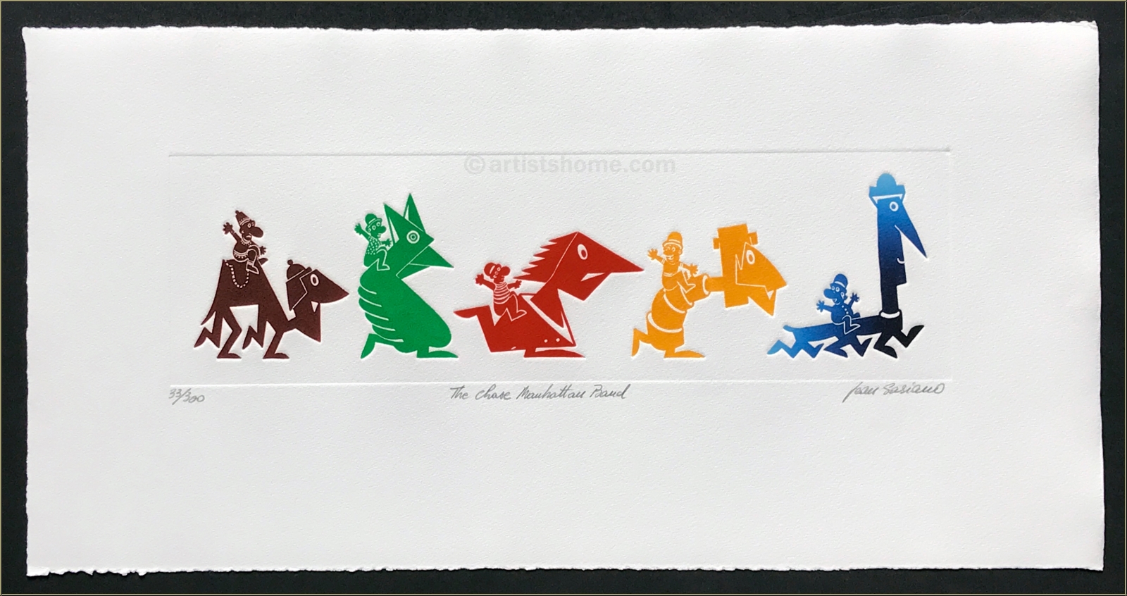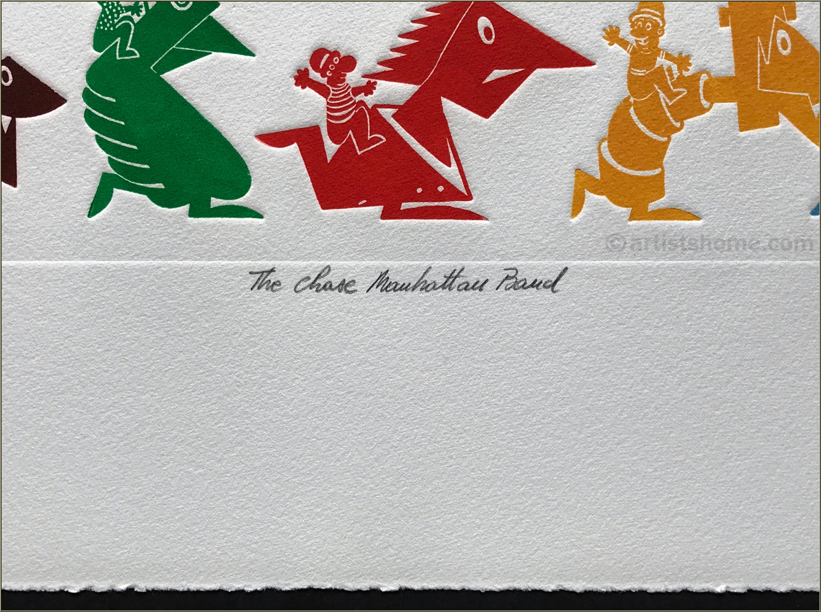 Details:"The Chase Manhattan Band" Farbiger Original-Prägedruck (Radierung), der in Anlehnung an die 1955 in den USA gegründete Rockefeller-Bank entstanden ist. Durch den Austausch des letzten Buchstabens und die liebevolle Zeichnung von fünf bunten "Bandmitgliedern" inszenierte Sariano quasi das Gegenteil einer grauen, langweiligen Bank.