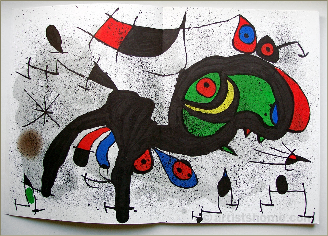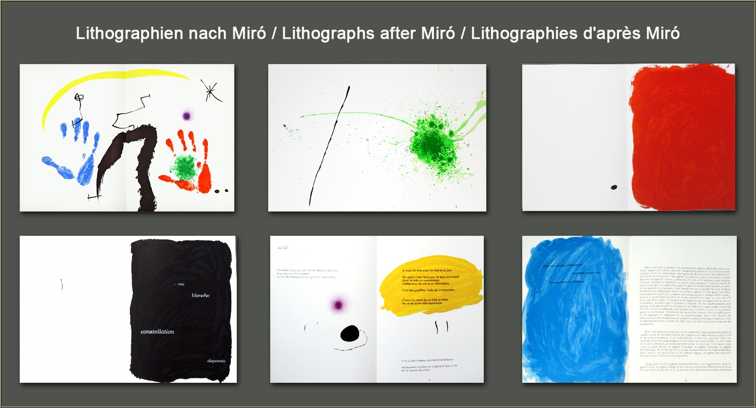Diese umfangreiche Ausgabe enthält 9 weitere dekorative Farblithographien nach Originalvorlagen Miros, die häufig als "Originale" angeboten werden. Mit Texten von Pierre Alechinsky und Jacques Dupin.