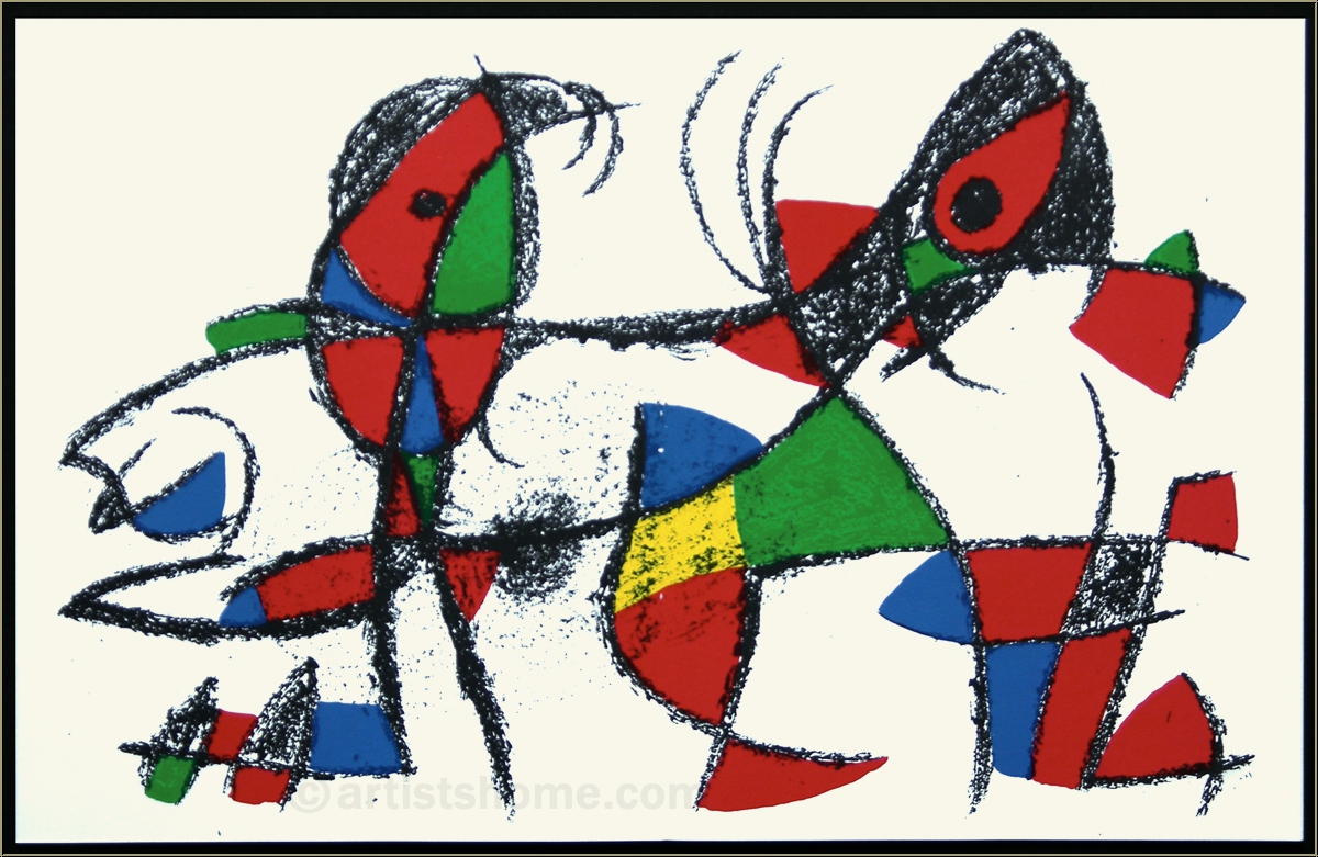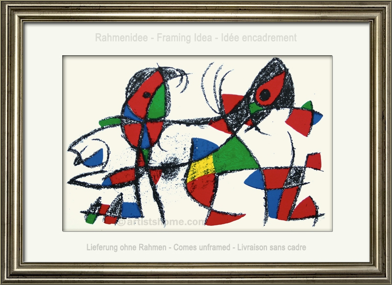 Details:»Originallithographie X« - Motiv: Delphin mit Papagei Wie kommt der Papagei auf den Delphin, oder: Über das Weglassen von Bildtiteln und seine Folgen. Eines ist gewiss: bei einigen seiner Werke, die Joan Miró ohne Namen oder Titel zurückließ, muss er das mit einem Augenzwinkern getan haben. Wissend um den allzu menschlichen Impuls, alles nur vage Sichtbare identifizieren und benennen zu wollen. Gönnen wir ihm seinen Spaß und lassen die vermutlich als Metapher gedachten Fguren und Symbole in dieser quirlig-heiteren Lithographie auf uns einwirken. Die phantasievollen Gedanken und Bilder, die im eigenen Kopf entstehen, sind das eigentliche Vermächtnis dieses großartigen Künstlers.