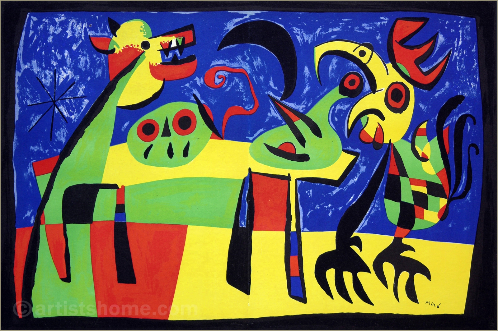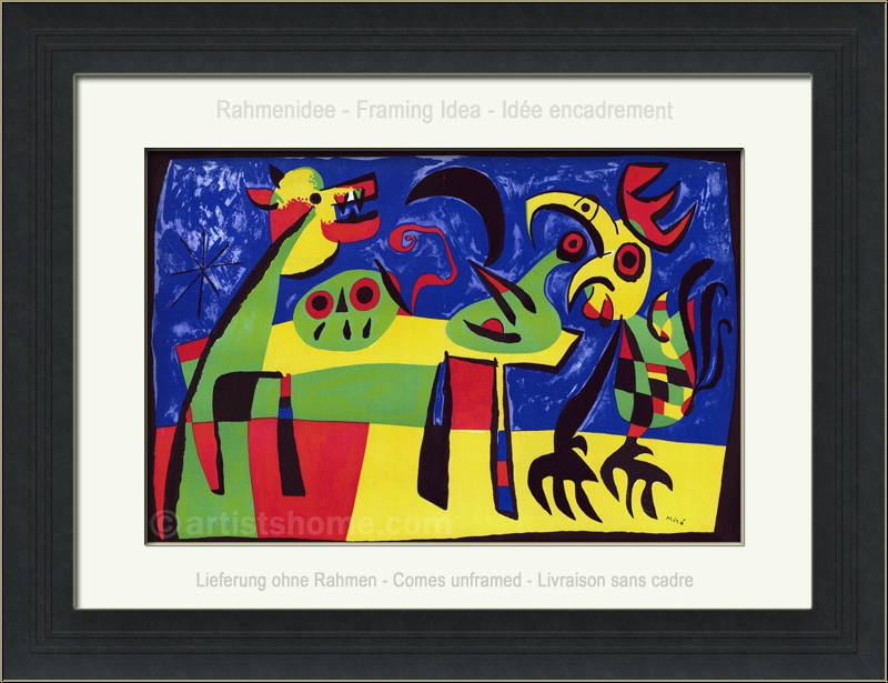Joan Miro lässt uns mit diesem wunderbaren Werk (Französischer Originaltitel: "Le chien aboyant à la lune réveille le coq - Der den Mond anbellende Hund weckt den Hahn") an einer anheimelnden Tischszene mit Hahn, Hund, Kürbis und einer vogelähnlichen Karaffe teilhaben - gäbe es da nicht im Hintergrund des Bildes eine schmollende Mondsichel, die sich ob des Hundegebells bereits schwarz geärgert zu haben scheint. Wie auch immer man dieses mit kubistischen Elementen gearbeitete "Ensemble" interpretieren möchte - man sollte es mit Humor tun. Das Blatt zählt zu den besonders imposanten aus dem druckgrafischen Oeuvre dieses großen Künstlers.