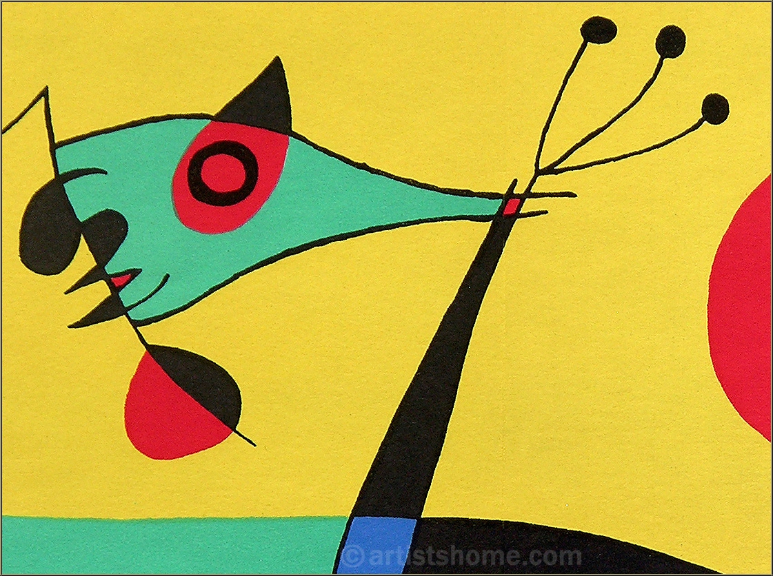 Details:Komposition (Pfauenfeder) Joan Miró, der vielen seiner Bilder keinen Titel gab, überlässt auch hier der Fantasie des Betrachters, wer wem nun ein prächtiges Federbüschel "stibitzt" - ist es ein Mäuschen, oder doch eher ein Vogel, der sich auf dem Rand eines Spiegels niedergelassen hat? Und ist der Besitzer dieser Feder wirklich ein Pfau, oder - wie der kleine, rote Rüssel links im Bild andeutet - das Schweinchen in uns, das sich mit fremden Federn schmückt? "Eitelkeit" scheint das Thema dieser Originalgrafik zu sein, beobachtet von einer gelassenen, roten Sonne. Liebhaber des frühen, kubistischen Mirós werden diese plastisch-surreale Arbeit des Künstlers zu schätzen wissen.