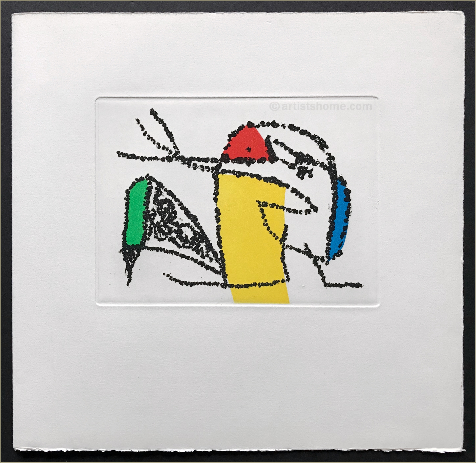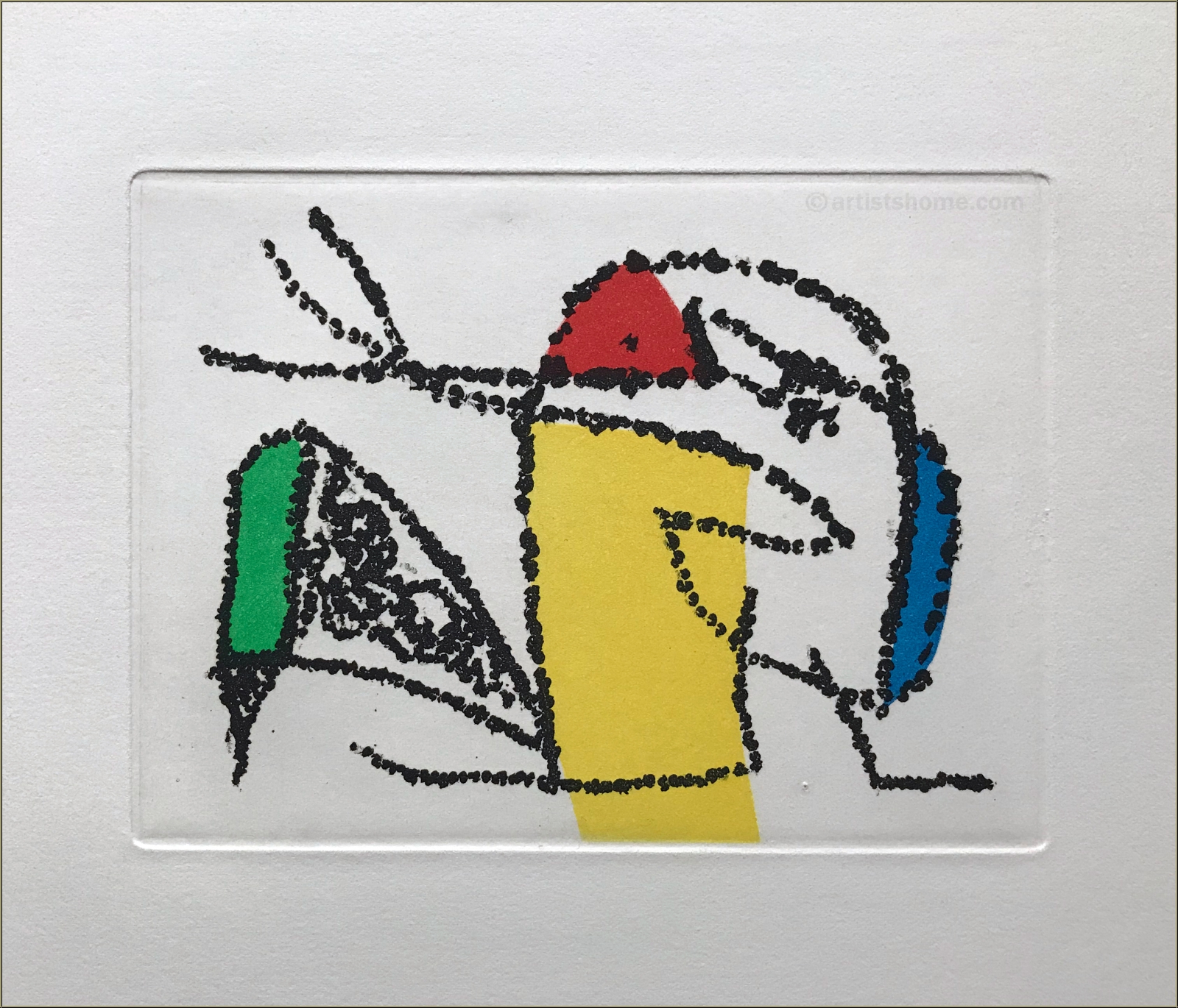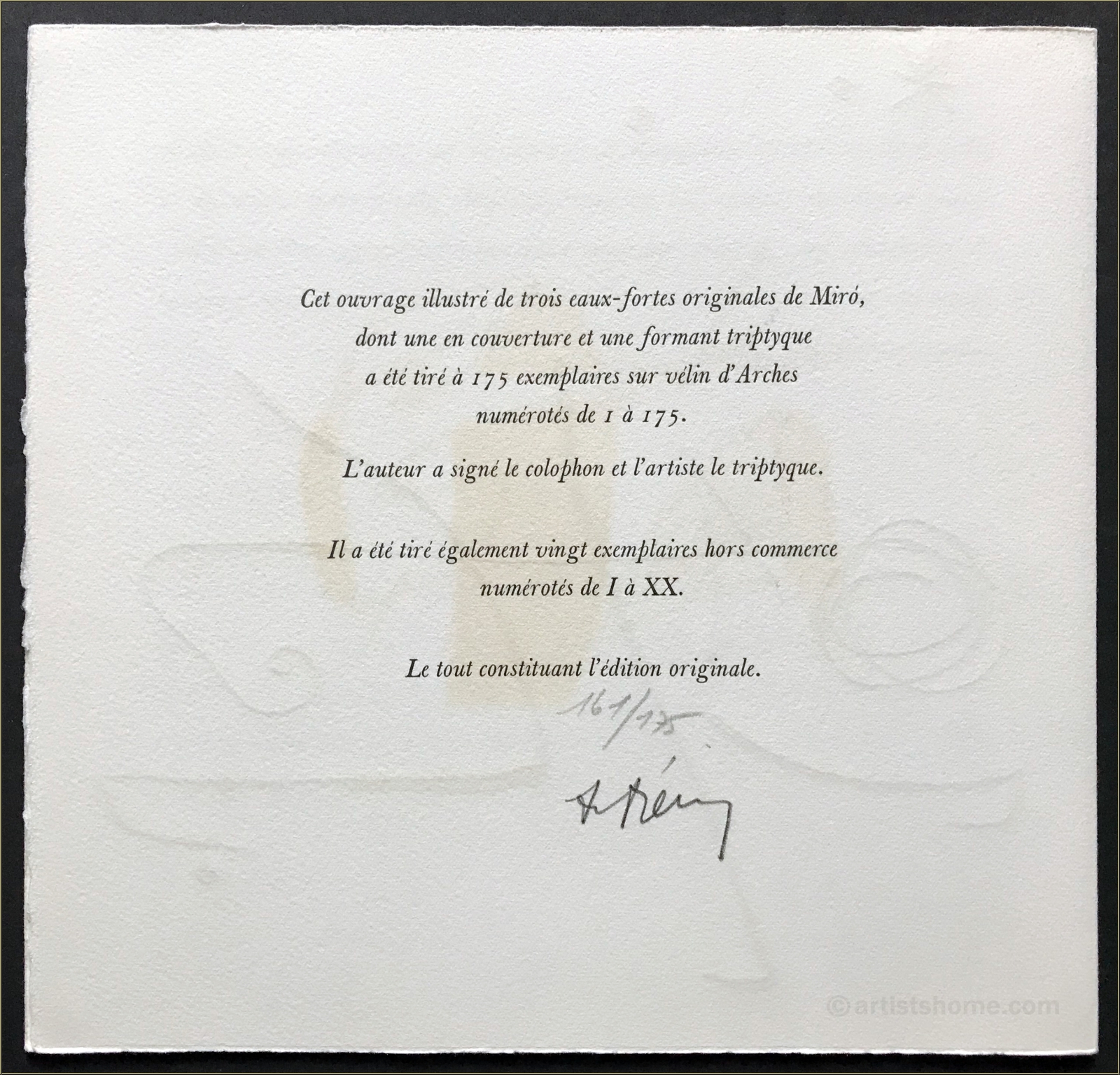 | | Beschreibung: | Seltenes, von Joan Miró liebevoll illustriertes Künstlerbuch in gelber Leinenkassette, mit 2 (von ursprünglich 3) Original-Farbradierungen mit Aquatinta. Insgesamt 28 Seiten in losen Lagen auf Arches Bütten, der Umschlag (s. Fotos 4 + 5) bildet eine der beiden Radierungen. Der Text (von André Frénaud, französisch) ist mit 4 Vignetten von Miro illustriert. Eines von nur 175 nummerierten und von Frénaud im Kolophon signierten Exemplaren. Die 3. von Miró signierte Radierung fehlt, ansonsten ist die Kassette komplett. Seit 1946 hat der Verleger Maeght in Paris einige der schönsten illustrierten Künstlerbücher herausgegeben, die in kleiner Auflage als "Grandes éditiones originales illustrées" heute nur noch hin und wieder bei renommierten Auktionshäusern zu finden sind. Die komplette Kassette mit 3 Radierungen wurde zuletzt im Jahr 2000 in New York von Christie's für 5.000 $ gehandelt (Kopie wird mitgeliefert). | | Größe: | 27,5 x 28 cm (Kassette) | | Papier: | Arches Bütten (mit Wasserzeichen) | | Signiert: | im Kolophon nummeriert (161/175) und von Frénaud in Bleistift signiert | | Verleger: | Maeght Éditeur, Paris | Werkverzeichnis/ Referenz: | L'univers d'Aimé et Marguerite Maeght, Fondation Maeght, Saint-Paul, 1982, S. 272, und Cramer 234. | | Zustand: | Erläuterungen hierzu Wohlerhaltenes, schönes Exemplar. Die gelbe Leinenkassette leicht angestaubt, der Inhalt in sehr gutem Zustand. | | Kundenbewertungen Bisher wurde noch keine Bewertung abgegeben. Bewertungen können nur von Kunden geschrieben werden, die den Artikel gekauft haben und eingeloggt sind. Ihre persönlichen Daten werden automatisch anonymisiert (Beispiel: "Jens H., Deutschland").  *Gültig für Lieferungen nach Deutschland bei Zahlung per PayPal. Bei Zahlung per Banküberweisung verlängert sich die Lieferzeit um 1-3 Tage ab dem Tag, an dem Sie überwiesen haben. Lieferzeiten für andere Länder sowie Informationen zur Berechnung des Liefertermins finden Sie hier |