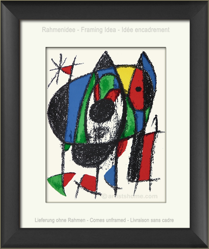 | | »Originallithographie V« - Motiv: Katze Die unternehmungslustig dreinschauende Katze kann natürlich auch ein bettelndes Hündchen mit erwartungsvoll gespitzten Ohren sein. Was auch immer Sie anhand der Linien, Formen und Farben assoziieren und mit Ihrer Phantasie verweben - es wäre Joan Miró gerade recht so gewesen. Die eigene Phantasie anzuregen, indem er manchmal auf Namen für seine Bilder verzichtete, das war seine Art, in einen heiteren Kontakt mit den Menschen zu treten, für die er seine Bilder malte. Technik/ Beschreibung: | Original-Farblithographie (Steindruck), ohne Titel Joan Miró zeichnete dieses Motiv persönlich auf den Stein, von dem dann die Lithographien abgezogen wurde. Sie wurden dem zweiten Band seines Oeuvre-Verzeichnisses beigebunden, der 1975 erschien. Hinweis: Dies ist KEIN späterer Kunstdruck (wie z.B. Photo- oder Grano-Lithographie), sondern die Original-Lithographie von 1975, die exakt so auch im Werkkatalog verzeichnet ist. | | Größe: | ca. 32 x 24,5 cm (Blattgröße) | | Auflage / Papier: | Hier eines der unsignierten Exemplare für die 1975 erschienenen Buchauflagen in verschiedenen Sprachen auf glattem Velin. Zusätzlich wurden 150 unsignierte Abzüge auf Rives Bütten sowie 80 vom Künstler signierte und nummerierte Exemplare auf Arches Bütten mit breitem Rand aufgelegt. | | Verleger: | Unterschiedliche Verleger je nach Land/Sprache (bspw. Maeght, Paris, für die französischsprachige Ausgabe). | | Druck: | Mourlot, Paris | | Anmerkungen: | Rückseitig typographisch bedruckt mit "Joan Miró Originallithographie V" (in unterschiedlichen Sprachen) | Werkverzeichnis/ Referenz: | Cramer, Patrick. Joan Miró. Lithographe V, Maeght Éditeur, Paris, 1992, Weber Genf, S. 145 u. 152, Nr. 1041, mit Abb. Sie erhalten mit der Lieferung einen Identitätsnachweis (ohne Preisangabe), falls das Blatt verschenkt werden soll. | | Zustand: | Erläuterungen hierzu Sehr schönes Exemplar aus dem Archiv. Lieferung: ungerahmt, verschenkfertig verpackt. | Kundenbewertungen Bisher wurde noch keine Bewertung abgegeben. Bewertungen können nur von Kunden geschrieben werden, die den Artikel gekauft haben und eingeloggt sind. Ihre persönlichen Daten werden automatisch anonymisiert (Beispiel: "Jens H., Deutschland").  *Gültig für Lieferungen nach Deutschland bei Zahlung per PayPal. Bei Zahlung per Banküberweisung verlängert sich die Lieferzeit um 1-3 Tage ab dem Tag, an dem Sie überwiesen haben. Lieferzeiten für andere Länder sowie Informationen zur Berechnung des Liefertermins finden Sie hier |
