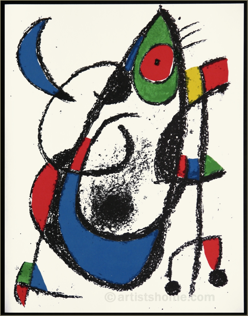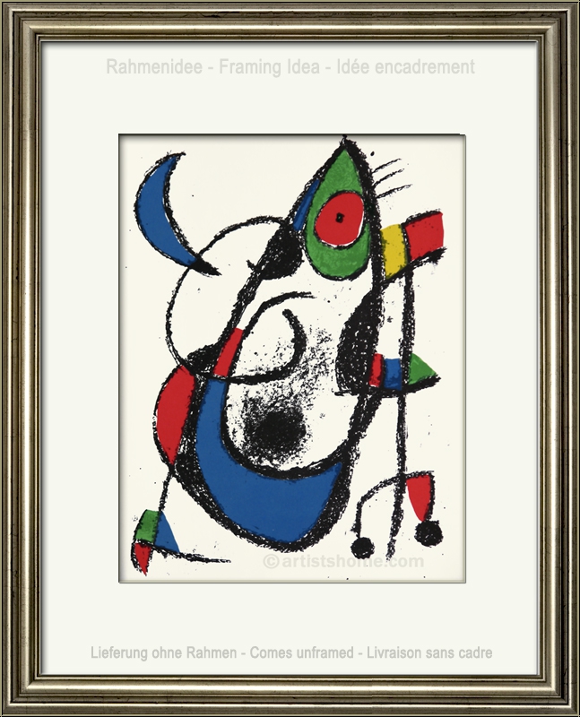| | »Originallithographie XI« - Motiv: Maus, emporschauend Die Wortschöpfung "Mondmäuschen" hätte ihm sicherlich gefallen... so spielerisch, wie Joan Miró seine Kunst oft anging, vor allem in seinen späten, weisen Jahren. Ob man in der hier vorliegenden Grafik nun ein Mäuschen mit einem Dreizack entdeckt, das den Mond anflirtet, oder einen Katzenfloh auf Wanderschaft - diese Grafik hat von Miró keinen Titel erhalten und erwartet somit die unvoreingenommene Interpretation des Betrachters. Technik/ Beschreibung: | Original-Farblithographie (Steindruck), ohne Titel Joan Miró zeichnete dieses Motiv persönlich auf den Stein, von dem dann die Lithographien abgezogen wurde. Sie wurden dem zweiten Band seines Oeuvre-Verzeichnisses beigebunden, der 1975 erschien. Hinweis: Dies ist KEIN späterer Kunstdruck (wie z.B. Photo- oder Grano-Lithographie), sondern die Original-Lithographie von 1975, die exakt so auch im Werkkatalog verzeichnet ist. | | Größe: | ca. 32 x 24,5 cm (Blattgröße) | | Auflage / Papier: | Hier eines der unsignierten Exemplare für die 1975 erschienenen Buchauflagen in verschiedenen Sprachen auf glattem Velin. Zusätzlich wurden 150 unsignierte Abzüge auf Rives Bütten sowie 80 vom Künstler signierte und nummerierte Exemplare auf Arches Bütten mit breitem Rand aufgelegt. | | Verleger: | Unterschiedliche Verleger je nach Land/Sprache (bspw. Maeght, Paris, für die französischsprachige Ausgabe). | | Druck: | Mourlot, Paris | | Anmerkungen: | Rückseitig typographisch bedruckt mit "Joan Miró Originallithographie XI" (in unterschiedlichen Sprachen) | Werkverzeichnis/ Referenz: | Cramer, Patrick. Joan Miró. Lithographe V, Maeght Éditeur, Paris, 1992, Weber Genf, S. 145 u. 158, Nr. 1047, mit Abb. Sie erhalten mit der Lieferung einen Identitätsnachweis (ohne Preisangabe), falls das Blatt verschenkt werden soll. | | Zustand: | Erläuterungen hierzu Sehr schönes Exemplar aus dem Archiv. Lieferung: ungerahmt, verschenkfertig verpackt. | Kundenbewertungen Bisher wurde noch keine Bewertung abgegeben. Bewertungen können nur von Kunden geschrieben werden, die den Artikel gekauft haben und eingeloggt sind. Ihre persönlichen Daten werden automatisch anonymisiert (Beispiel: "Jens H., Deutschland").  *Gültig für Lieferungen nach Deutschland bei Zahlung per PayPal. Bei Zahlung per Banküberweisung verlängert sich die Lieferzeit um 1-3 Tage ab dem Tag, an dem Sie überwiesen haben. Lieferzeiten für andere Länder sowie Informationen zur Berechnung des Liefertermins finden Sie hier |