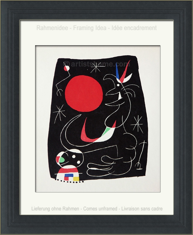 Details:Komposition (Nachthimmel) Zu vielen seiner Grafiken hat Miró keinen Titel "mitgeliefert" - vielleicht auch, um die Menschen zu intensiverer Beschäftigung mit dem jeweiligen Motiv anzuregen. Wie fast immer in seinen Werken gibt es auch in dieser sehr typischen und frühen Grafik Unmengen zu entdecken, wobei sich Mirós Lieblingssymbole wie die "rote Sonne", Sterne und allerlei surreale Gestalten hier vor einem unendlichen, tiefschwarzen Universum zu tummeln scheinen.