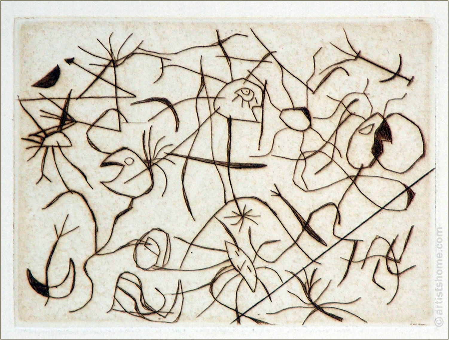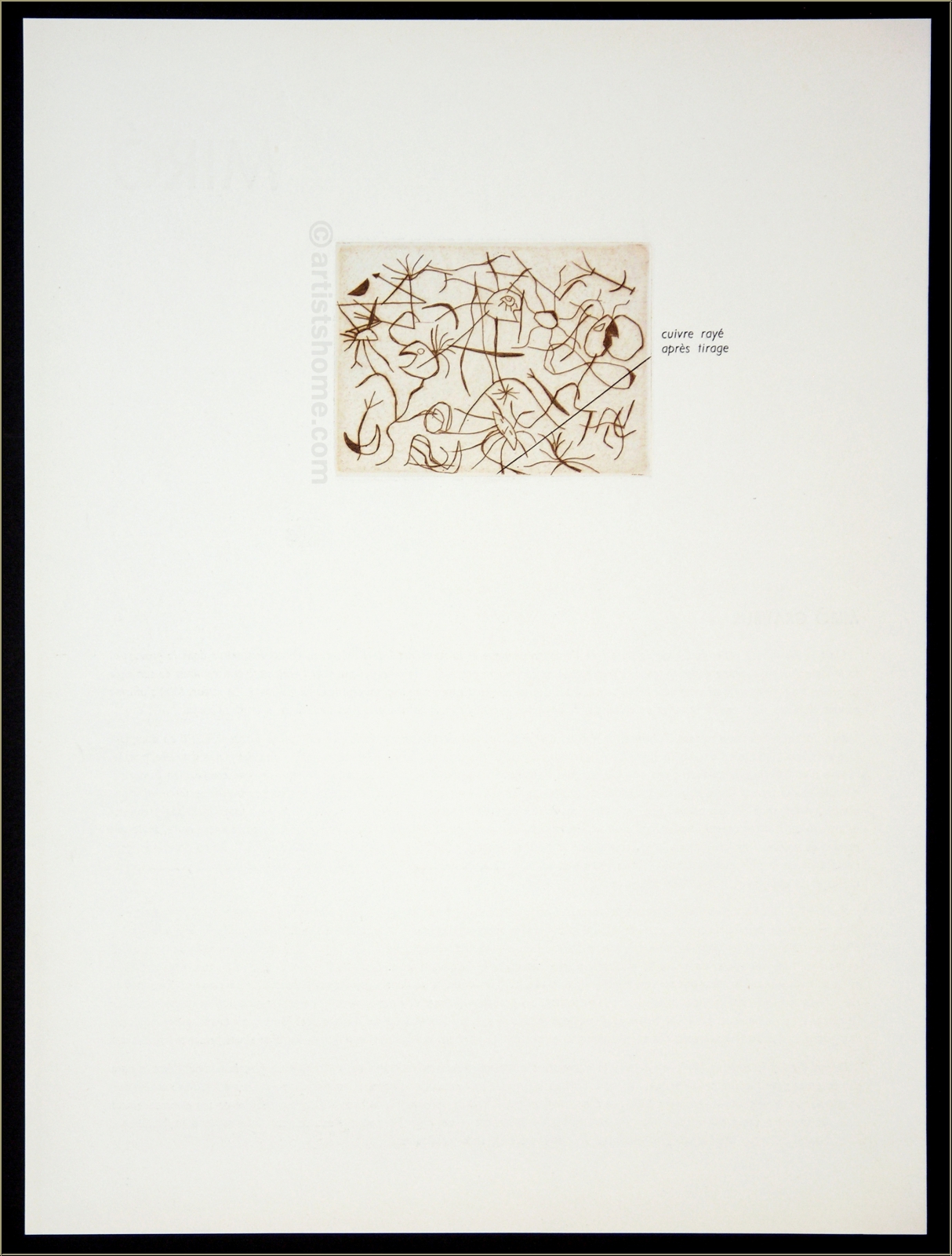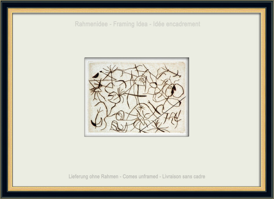 Details:"Astres et danseurs", 1938 "Sterne und Tänzer" lautet der poetische Titel dieser galaktischen kleinen Radierarbeit von Joan Miró - seiner sechsten Radierung überhaupt, laut Werkverzeichnis. Nach dem Druck der signierten Auflage im Jahr 1938 (rund 50 Abzüge auf unterschiedlichen Papieren und in unterschiedlichen Stadien) wurde die Kupferplatte gestrichen.