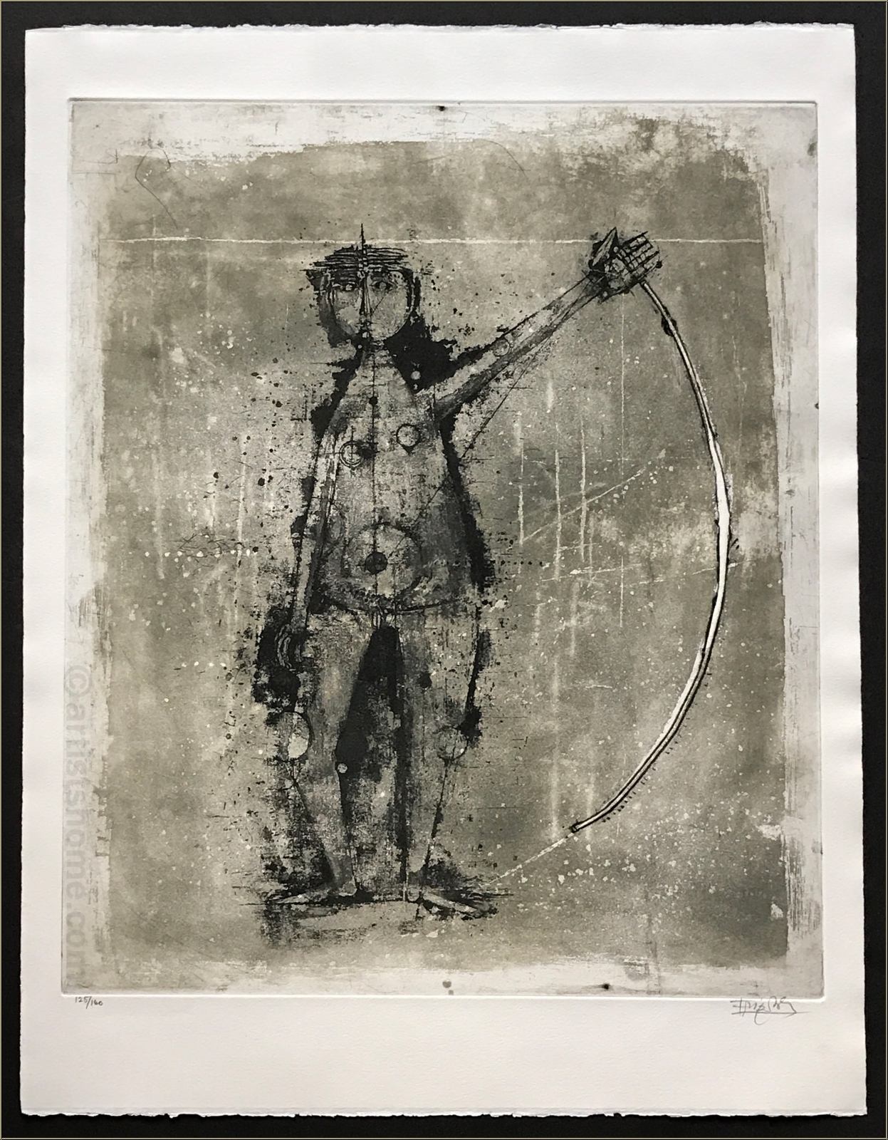 Details:"Hommage à Dürer" - 1971 Diese Originalradierung ist eine der wenigen figürlichen Arbeiten Friedlaenders, gewidmet Albrecht Dürer, der exakt 500 Jahre vor Entstehung dieses Bildes geboren wurde (1471). Wie auch Johnny Friedlaender gilt Dürer als Meister der Graphik, wobei dieser sich im Wesentlichen mit den Techniken des Holzschnitts und Kupferstichs befasste, während Friedlaender ein geradezu enthuastischer und begnadeter Radierer war.