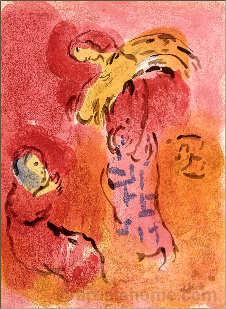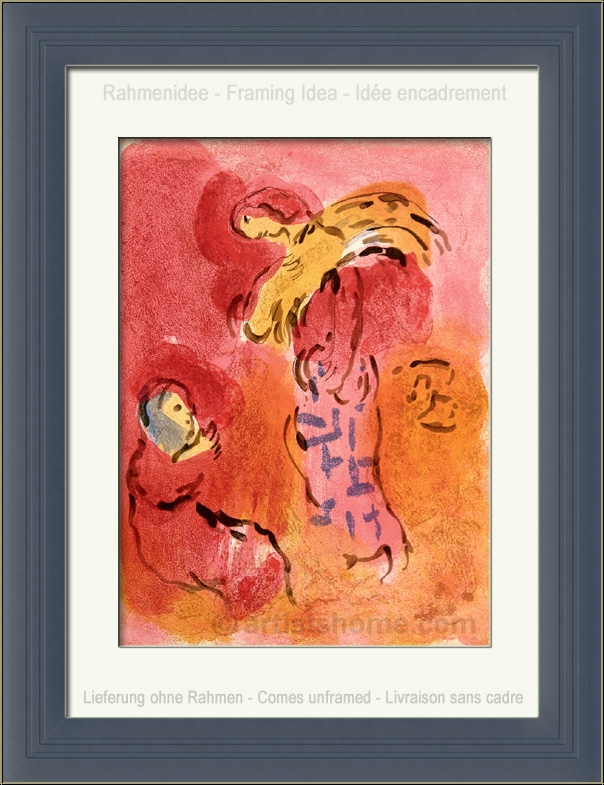 Details:"Ährenleserin Ruth" 2. Grafik zum "Buch der Rut" In diesem zweiten von insgesamt fünf Bildern zum Leben der Ruth zeigt Chagall uns seine "Heldin", die gerade vom Ährensammeln zurückkehrt, freudig begrüßt von ihrer Schwiegermutter Naemi (Noomi). Schwer hat es die Schwiegertochter, die als Ausländerin in der Fremde für das Überleben der beiden Frauen sorgen muss (Buch Rut 2,1-3). Dennoch hat Chagall für dieses Motiv leuchtende, fröhliche Rosatöne gewählt - vielleicht, um anzudeuten: hier geht es um Liebe, in mehrererlei Hinsicht. Um die fürsorgliche Liebe der Schwiegertochter, der es durch ihren Fleiss gelingt, sie beide am Leben zu erhalten. Und um den Beginn der Liebe zwischen Ruth und Boas, der schon bald auf die ungewöhnliche Frau aufmerksam wird und sich in sie verliebt. Marc Chagall hat dem Buch der Ruth eine Folge von 5 Lithographien gewidmet - dies ist das zweite Blatt zu der Frau, die durch ihre Liebe, Treue und Beharrlichkeit zu Boas Ehefrau und somit zur Urmutter König Davids wird.
