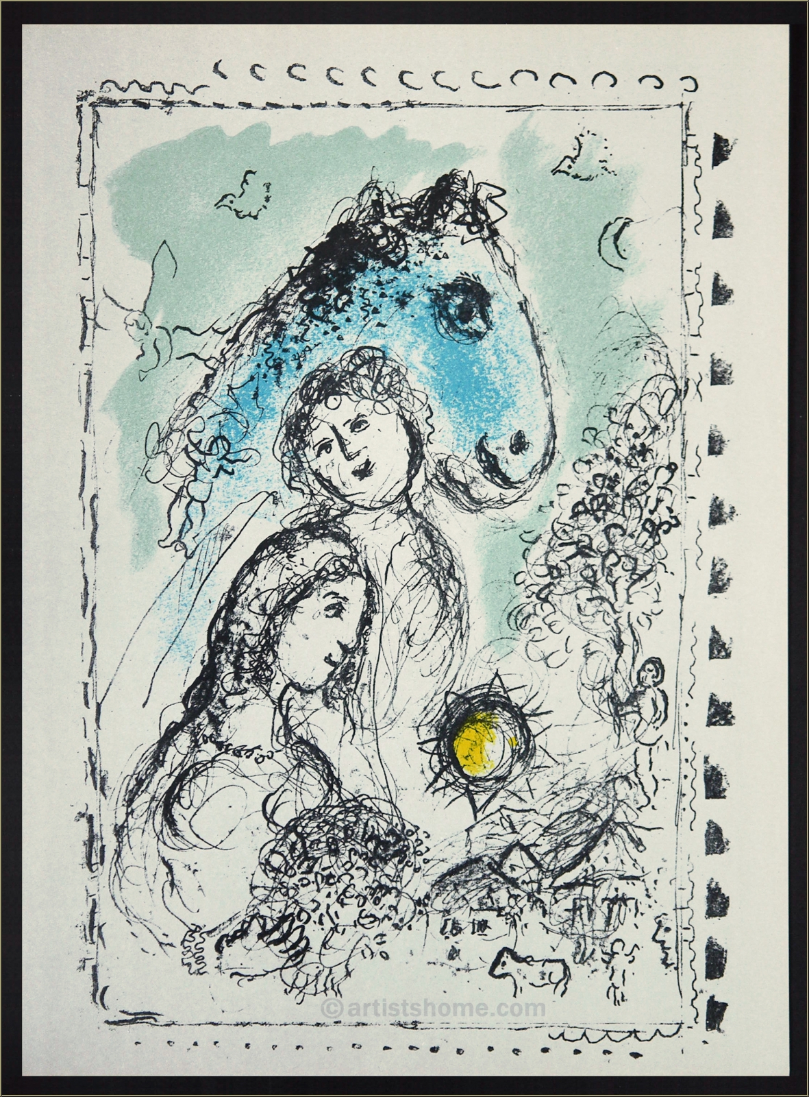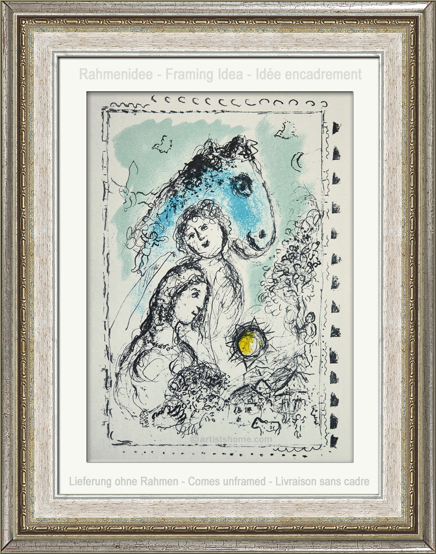 Details:"Blaues Pferd mit Paar" (Cheval bleu au Couple) Mit feinem Strich und unzähligen kleinen Symbolen und Details zeichnete Marc Chagall 1982 dieses Bild zweier Liebender auf den Lithostein. Es ist die Hommage des Künstlers an das bekannte französische Verlegerpaar Marguerite und Aimé Maeght, das kurz zuvor verstorben war und nun mit einer Sonderausgabe seiner berühmten Kunstzeitschrift Derrière le miroir geehrt werden sollte.
