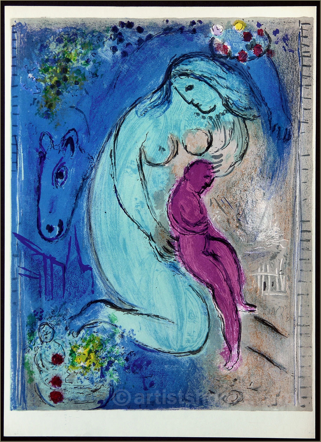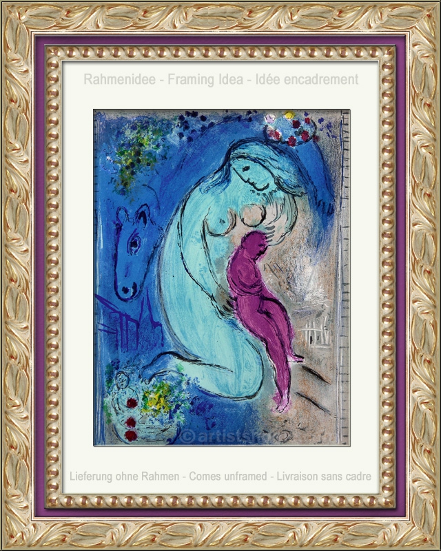 Details:Blumen-Kai ("Quai aux Fleurs") Wie so oft in Chagalls Bildkompositionen vereint sich auch in "Quai aux Fleurs" räumlich Getrenntes im gleichen Bild, wechselte er den Maßstab, wie es ihm angemessen schien und setzte seiner Protagonistin den Kopf verkehrt herum auf. Alles scheint in diesem Bild zu schweben, selbst die Kathedrale (Notre-Dame?) und auch das vertraute Chagallsche Tier, verstärkt durch das intensive Blau des Himmels über Paris. Ein Geheimnis bleibt der blumengeschmückte Arm, der aus dem Nichts herabragt und das ungleiche Paar zu beschützen scheint. Für diese herrliche Grafik hat Chagall insbesondere die hellen Pastelltöne so abgestuft, dass sie wie handkoloriert wirken.
