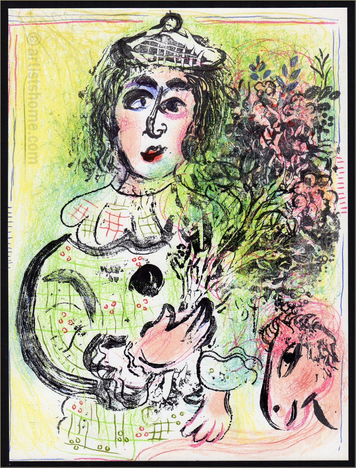 | | "Blumengeschmückter Clown" (Mourlot 399) Schon die verwendeten Pastelltöne Maigrün, Sonnengelb und Zartrosa machen deutlich - hier geht es um die schönste Herzensangelegenheit, die Liebe. Ein etwas verklärt und gleichzeitig schüchtern dreinblickender Clown drückt einen riesigen Blumenstrauß an sein Herz und scheint von Chagalls Lieblingstier, dem Eselchen, angeschubst zu werden... "Na los, trau dich endlich!". | Technik: | Original-Farblithographie (Steindruck) "Le Clown fleuri" Hinweis: Dies ist KEIN späterer Kunstdruck, sondern die Original-Lithographie, wie sie exakt so auch im Werkkatalog verzeichnet ist! | | Jahr: | 1963 | | Auflage/Papier: | Hier ein Exemplar aus der unsignierten Originalauflage auf kräftigem Vélin. Zusätzlich wurden damals 150 Exemplare auf Arches Bütten mit breitem Rand abgezogen und vom Künstler signiert u. nummeriert. | | signiert: | unsigniert, wie erschienen | | Verleger: | Éditions André Sauret, Monte-Carlo, 1963 | | Anmerkung: | Für die maßgeblichen Bände über sein lithographisches Gesamtwerk schuf Marc Chagall zwischen 1960 und 1974 insgesamt 28 blattgroße Original-Lithographien, die in späteren Jahren als Kunstdrucke auf Büttenpapier reproduziert wurden und heute oft mit den Originalen verwechselt werden. | Werkverzeichnis/ Referenz: | Mourlot, Fernand. Chagall Lithograph [III] 1962-1968, André Sauret, Monte Carlo, 1969, Nr. 399 Sie erhalten mit der Lieferung den vollständigen Auszug aus dem o.g. Werkverzeichnis zu Ihrem Blatt sowie zusätzlich einen Identitätsnachweis (ohne Preisangabe, falls das Blatt verschenkt werden soll). | | | Kundenbewertungen Bisher wurde noch keine Bewertung abgegeben. Bewertungen können nur von Kunden geschrieben werden, die den Artikel gekauft haben und eingeloggt sind. Ihre persönlichen Daten werden automatisch anonymisiert (Beispiel: "Jens H., Deutschland").  *Gültig für Lieferungen nach Deutschland bei Zahlung per PayPal. Bei Zahlung per Banküberweisung verlängert sich die Lieferzeit um 1-3 Tage ab dem Tag, an dem Sie überwiesen haben. Lieferzeiten für andere Länder sowie Informationen zur Berechnung des Liefertermins finden Sie hier |
