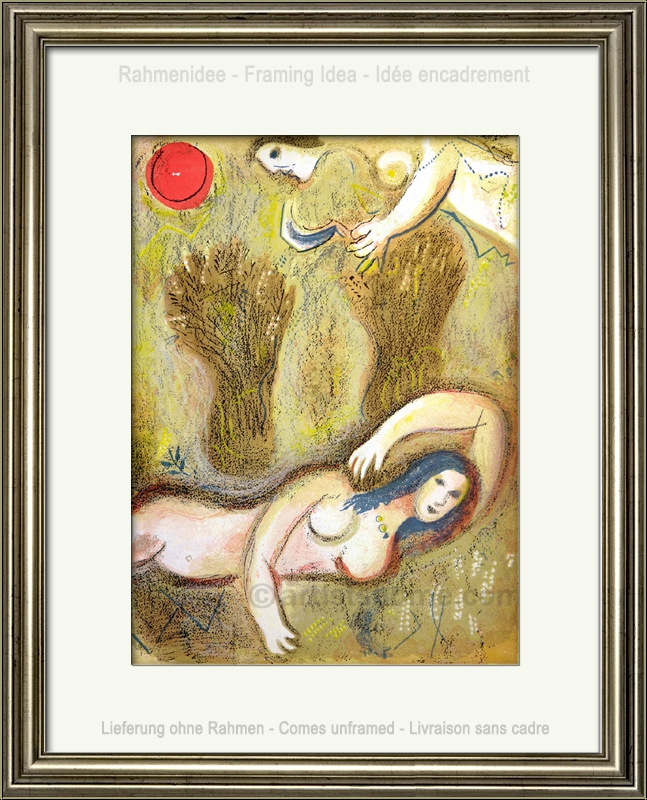 Details:"Boas erwacht und sieht Ruth zu seinen Füßen" 5. Grafik zum "Buch der Rut" Der Morgen danach - eine milde Sonne taucht diese Liebesszene in ein freundlich strahlendes Licht. Anders als im vorhergehenden Motiv "Ruth zu Füßen des Boas" sind die beiden Liebenden nun nackt. Sie wirken entspannt und erfüllt. In diesem den Ruth-Zyklus abschließendem Motiv (Rut 3,8 ff) lässt uns Chagall bereits ahnen, wie es zwischen den beiden nun weitergehen wird: durch geschicktes Verhandeln mit seinem Kontrahenten erwirbt Boas das Recht, Ruth zur Frau zu nehmen. Somit wird sie, die als mittellose, verwitwete Ausländerin gesellschaftlich geächtet war, durch ihre Nachkommen zur Urgroßmutter einer der wichtigsten biblischen Figuren: die des David, König von Juda und Israel.