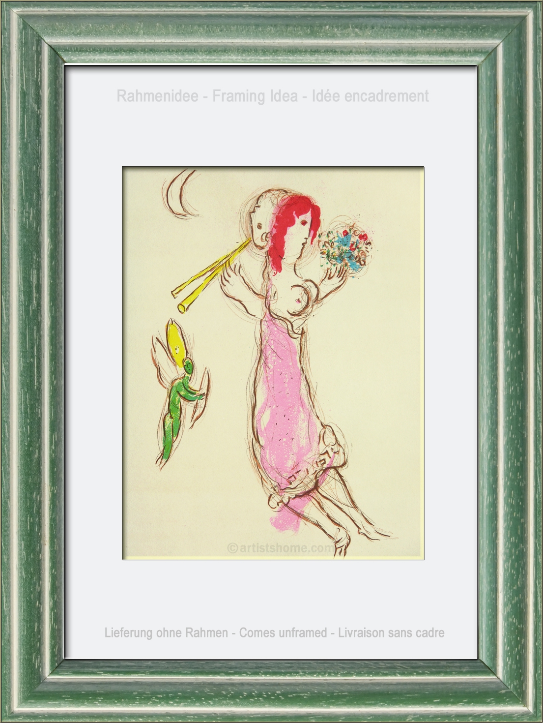 Details:"Daphnis und Chloe" Im Zuge der Arbeiten an seinem berühmten Künstlerbuch gleichen Titels zeichnete Chagall diese zarte Liebesszene zwischen Daphnis und Chloé unter den Augen des Mondes, die vermutlich dem ersten oder zweiten Buch zuzuordnen ist. Denn die beiden verschmolzenen Körper deuten zwar bereits die innige Beziehung an, die das Mädchen und den Jungen verbinden wird, die Gesichter der beiden sind jedoch noch voneinander abgewandt. Und auch der kleine Eros scheint seinen Bogen noch nicht gespannt zu haben, was auf die über viele Jahre hinweg andauernde, zunächst rein freundschaftliche Bindung der beiden hinweist. Eine sehr anmutige und angenehm schlichte Illustration Chagalls, die auf elfenbeinfarbenem Grund gedruckt und 1960 der französischen Publikation "Nouvelles situations de l'art contemporain" beigebunden wurde.