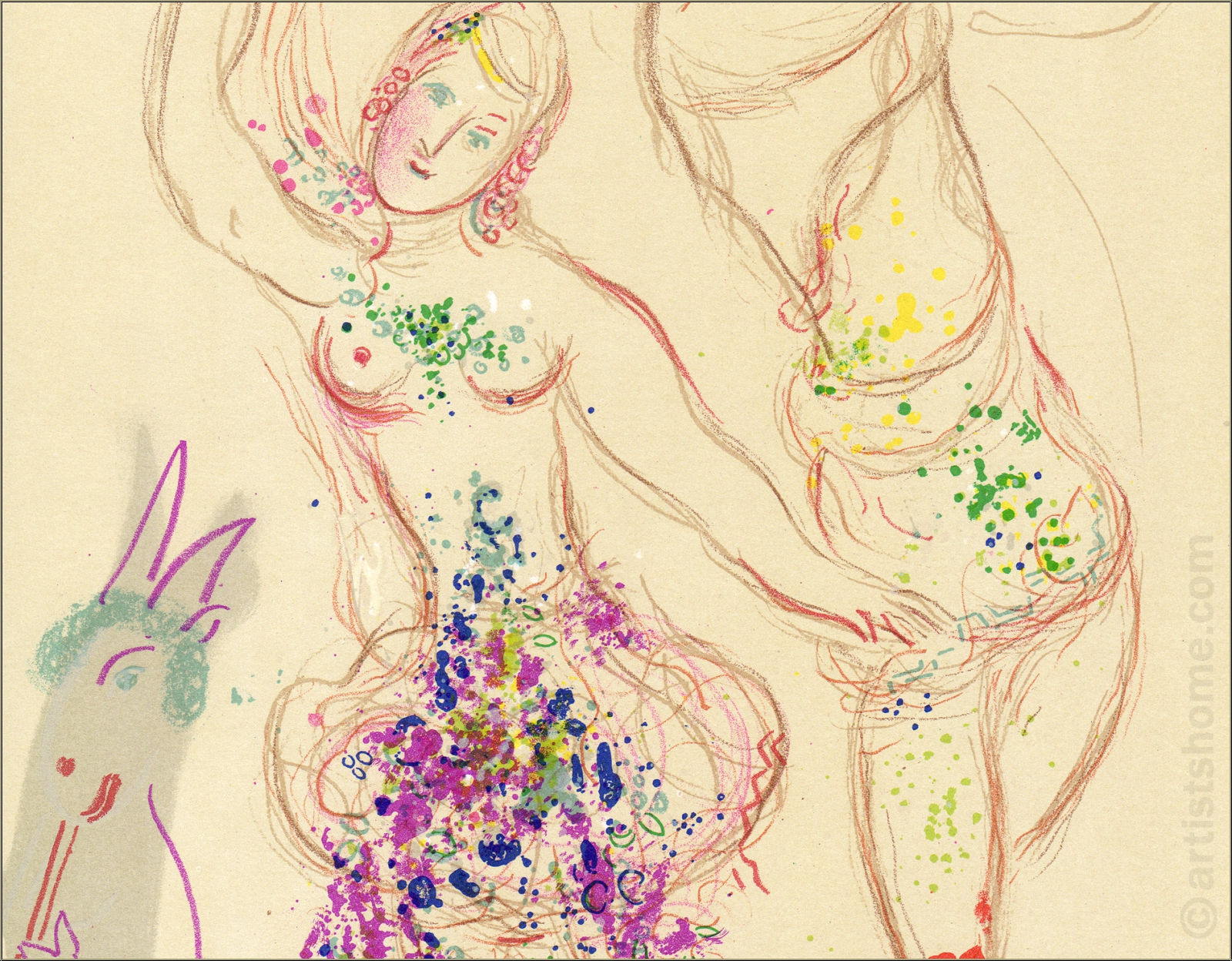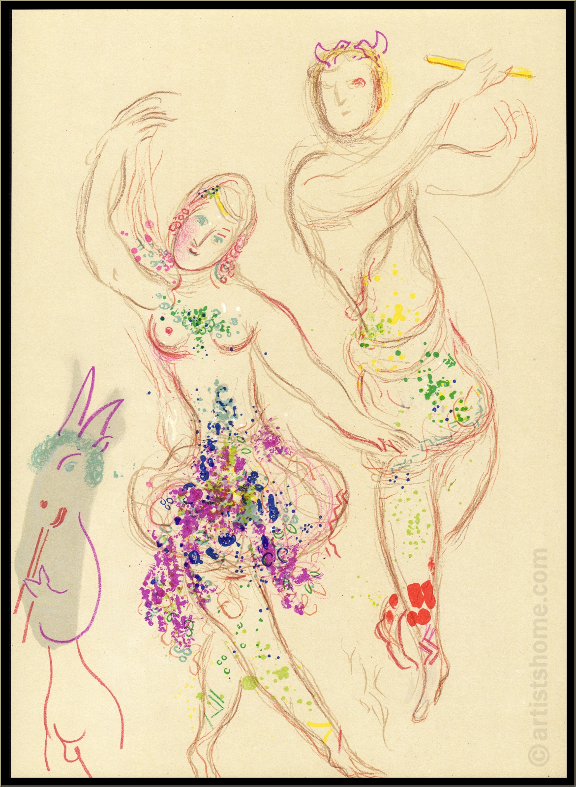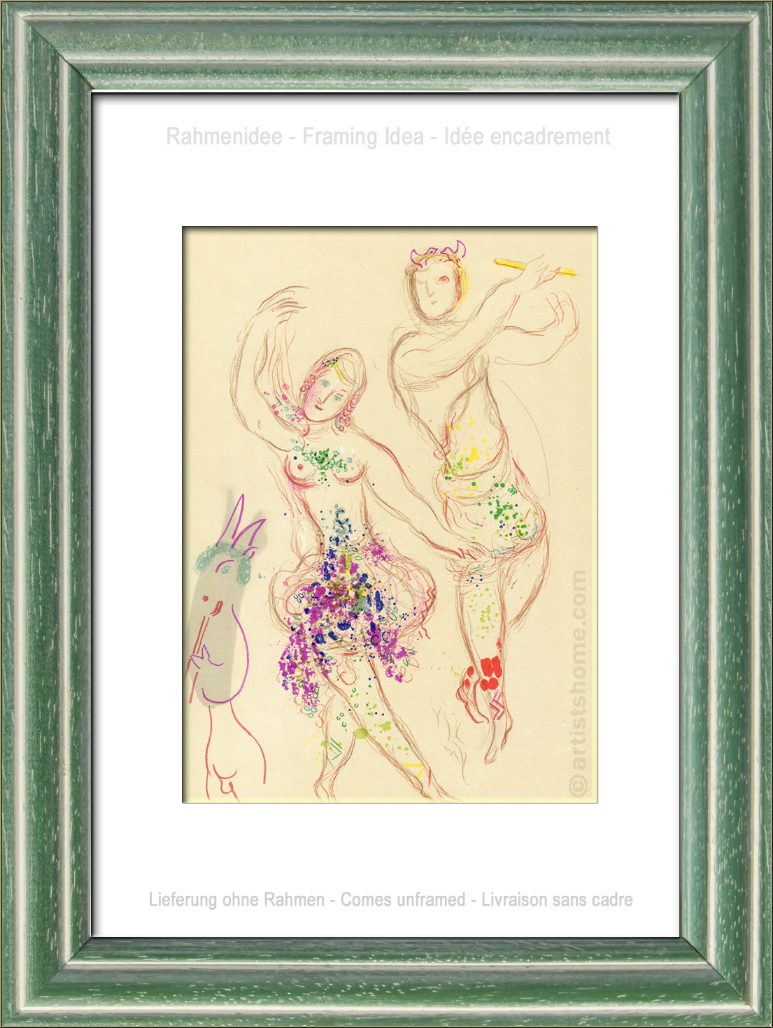 Details:"Das Ballett" (Le Ballet) - Daphnis und Chloé Chagall, als Maler in der Bildenden Kunst zuhause, begeisterte sich sein Leben lang auch für die musikalischen Ausdrucksformen der Schönen Künste: Für die Werke der großen Komponisten samt ihrer darstellenden Disziplinen wie Theater, Oper und Ballett. So entwarf Marc Chagall für gleich drei berühmte Ballettinszenierungen sowohl die Bühnendekoration, als auch die Kostüme der Darsteller, wovon zwei während seines Aufenthaltes in den USA wegen des Zweiten Weltkriegs für die "Ballets Russes" entstanden: 1942 für Tschaikowskis "Aleko", und 1945 für Igor Strawinskys "Der Feuervogel" (L'oiseau de feu). Erst viele Jahre später, längst zurück in Frankreich, beauftragte ihn die Pariser Oper mit den Arbeiten für "Daphnis und Chloé" in der Inszenierung von Maurice Ravel im Jahr 1959. Für den zehn Jahre später erschienenen Band über seine Arbeiten für das Ballett zeichnete Marc Chagall schließlich diese zarte, anmutige Farblithographie mit einer Szene aus "Daphnis und Chloé" und den von ihm entworfenen Kostümen für die beiden Protagonisten.