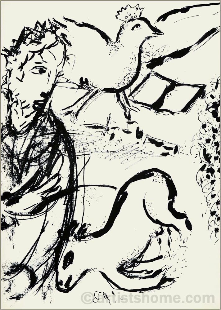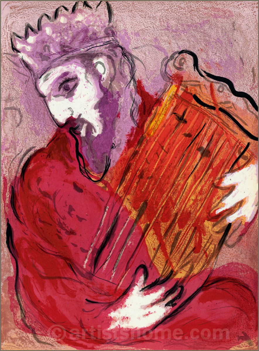 Details:"David mit der Harfe" (Die Könige) David (um 1000 v. Chr.) war unbestritten der bedeutendste Herrscher des jüdischen Volkes. Nicht nur politisch galt er als Genie - er einte das Nordreich Israel und das Südreich Juda - sondern auch schriftstellerisch und musikalisch. Ihm werden ein Großteil der Psalmen zugeschrieben, jene Gebete und Lieder, die im Ersten Testament zu einem eigenen Buch zusammengefasst sind. Chagall hat David in diesem Werk mit seiner Harfe dargestellt, die er meisterhaft spielte. Behutsam hält er sie in den Armen, sein Blick ist nachdenklich, gedankenverloren, in sich versunken. Das Gesicht leuchtet weiß - Zeichen für die Erleuchtung, die ihm von Gott zuteil wurde? Die gleiche weiße Farbe findet sich in seinen Händen wieder, vielleicht weil er das, was er mit Herz und Verstand erkannt hatte, auch ausführte. Der violette Hintergrund versinnbildet die Gegenwart Gottes, den eigentlichen König und Herrn über Israel.