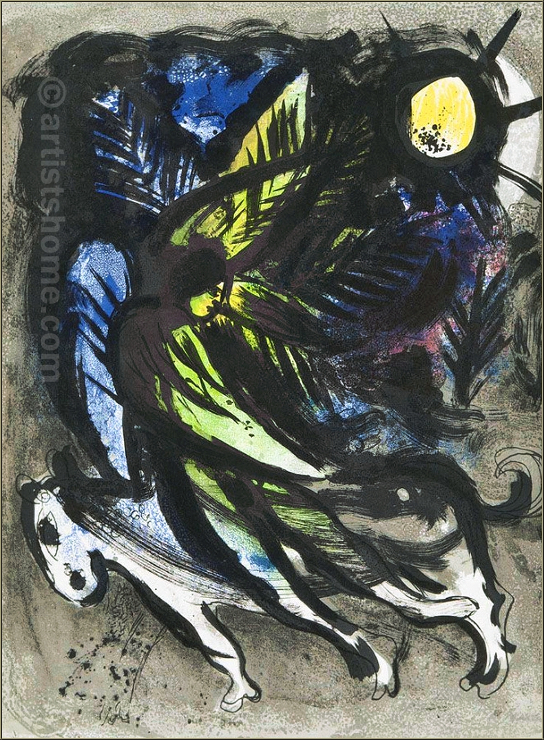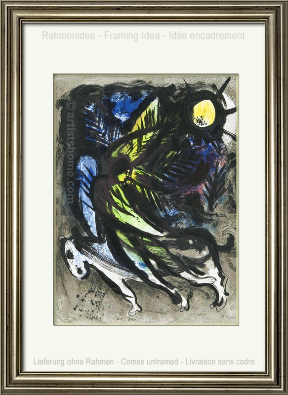 Chagall erweckt mit dieser eindrucksvollen Darstellung den Anschein, als würde der Engel auf dem Rücken des Tieres gegen Naturgewalten in Schwarz und Tiefblau ankämpfen. Kompositorisch wie auch farblich ist dem Künstler hier ein besonders kraftvolles Bild gelungen. Trotz zarter Technik der Lithographie ist dieses Werk mit der Erscheinung eines dynamischen Ölgemäldes zu vergleichen.