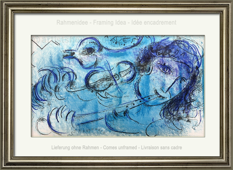 | | "Der Flötenspieler / Le Joueur de Flûte" In Himmelblau lässt Marc Chagall in dieser Grafik den Flötisten seinem Instrument Klänge entlocken, denen der Hahn andächtig lauscht, während ein Mensch (unten rechts im Bild) dazu zu tanzen scheint. Die Geige bzw. Violine macht aus dem Solisten ein Ensemble - ein optisch wie musikalisch schönes Pendant zu der Farblithographie "Der Akkordeonspieler", die im gleichen Jahr erschienen ist. | Technik: | Original-Farblithographie (Mourlot 197) Hinweis: Dies ist KEIN Kunstdruck, sondern die Original-Lithographie (Steindruck), wie sie exakt so auch im Werkkatalog verzeichnet ist! Achtung: es existieren zahlreiche Nachdrucke (Reproduktionen) aus einer nicht authorisierten, späteren Auflage. Diese Drucke sind keine Original-Lithographien! | | Jahr: | 1957 | | Größe: | 23 x 39 cm (Blattgröße) | | Auflage | Papier: | Hier eines von 6000 unsignierten Exemplaren auf leichtem Velin. Zusätzlich wurden damals 90 Exemplare auf Arches Bütten mit breitem Rand gedruckt und vom Künstler signiert und nummeriert. Mit dem schwach sichtbaren obligatorischen Mittelfalz, wie 1957 erschienen. | | Verleger: | Maeght Editeur, Paris | | Druck: | Mourlot, Paris | Werkverzeichnis/ Referenz: | Mourlot, Fernand. Chagall Lithograph [II] 1957-1962, André Sauret, Monte-Carlo 1963, Seiten 20-29, Nr. 197 Sie erhalten mit der Lieferung den Auszug aus diesem Verzeichnis, sowie zusätzlich einen Identitätsnachweis (ohne Preisangabe), falls das Blatt verschenkt werden soll. | | Zustand: | Erläuterungen hierzu Sehr schönes Exemplar aus dem Archiv. In diesem Zustand sehr selten! Lieferung ohne Rahmen. | Dieses Blatt wird durch unseren Geschenk-Service verpackt Kundenbewertungen Bisher wurde noch keine Bewertung abgegeben. Bewertungen können nur von Kunden geschrieben werden, die den Artikel gekauft haben und eingeloggt sind. Ihre persönlichen Daten werden automatisch anonymisiert (Beispiel: "Jens H., Deutschland").  *Gültig für Lieferungen nach Deutschland bei Zahlung per PayPal. Bei Zahlung per Banküberweisung verlängert sich die Lieferzeit um 1-3 Tage ab dem Tag, an dem Sie überwiesen haben. Lieferzeiten für andere Länder sowie Informationen zur Berechnung des Liefertermins finden Sie hier |