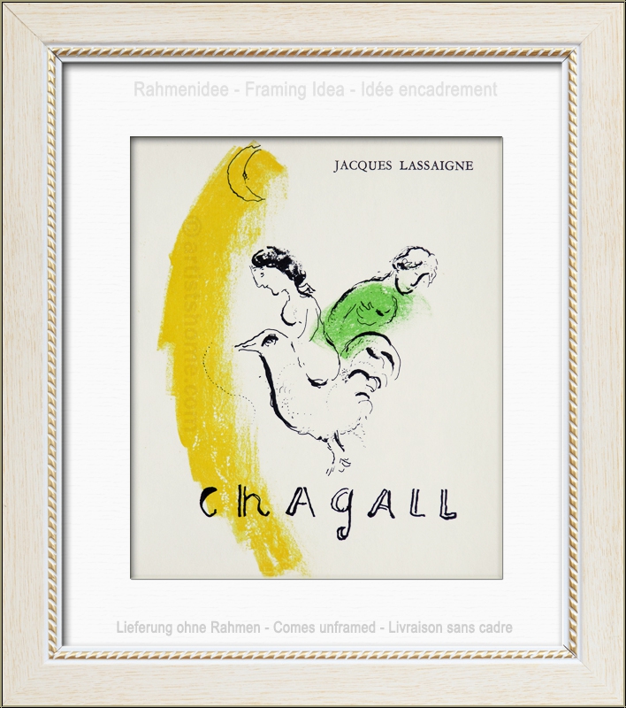 | | "Der Hahn und die Mondsichel" (Le Coq au Croissant) Das auf die Erde herab scheinende gelbe Licht einer Mondsichel beleuchtet ein offensichtlich sehr privates Geschehen aus dem Leben des Künstlers: eine Frau, von ihm abgewandt und im Begriff, auf einem Hahn davonzuschweben. Daneben ein traurig blickender Mann mit der linken Hand auf seiner Brust - eine Abschiedsszene. Diese berührende kleine Lithographie zeichnete Chagall für die Titelseite der 1957 erschienenen Monographie über sein bisheriges Leben als Maler. | Technik: | Original-Farblithographie (Steindruck) Hinweis: Dies ist keine Kopie aus dem unauthorisierten Nachdruck späterer Jahre, wie sie zuhauf im Internet angeboten werden, sondern die Original-Lithographie, wie sie exakt so auch im Werkkatalog verzeichnet ist. Auch dieses Blatt hat - neben der unterschiedlichen Papiersorte - ein eindeutiges Merkmal, anhand dessen man die Originale von den Kopien unterscheiden kann. | | Jahr: | 1957 | | Größe: | 23 x 20 cm (Blattgröße) | | Auflage | Papier: | Eines von 6000 unsignierten Exemplaren auf leichtem Velin. Zusätzlich wurden damals 90 Exemplare auf Arches Bütten mit breitem Rand gedruckt und vom Künstler signiert und nummeriert. | | Verleger: | Maeght Editeur, Paris | | Druck: | Mourlot, Paris | Werkverzeichnis/ Referenz: | Mourlot, Fernand. Chagall Lithograph [II] 1957-1962, André Sauret, Monte-Carlo 1963, Seiten 20-29, Nr. 193 Sie erhalten mit der Lieferung den Auszug aus diesem Verzeichnis, sowie zusätzlich zur Rechnung einen Identitätsnachweis (ohne Preisangabe), falls das Blatt verschenkt werden soll. | | Zustand: | Erläuterungen hierzu Schönes Exemplar dieser empfindlichen Grafik. Der gezeigte Rahmen gehört nicht zum Lieferumfang, er dient lediglich Ihrer Inspiration. | Dieses Blatt wird durch unseren Geschenk-Service verpackt Kundenbewertungen Bisher wurde noch keine Bewertung abgegeben. Bewertungen können nur von Kunden geschrieben werden, die den Artikel gekauft haben und eingeloggt sind. Ihre persönlichen Daten werden automatisch anonymisiert (Beispiel: "Jens H., Deutschland").  *Gültig für Lieferungen nach Deutschland bei Zahlung per PayPal. Bei Zahlung per Banküberweisung verlängert sich die Lieferzeit um 1-3 Tage ab dem Tag, an dem Sie überwiesen haben. Lieferzeiten für andere Länder sowie Informationen zur Berechnung des Liefertermins finden Sie hier |