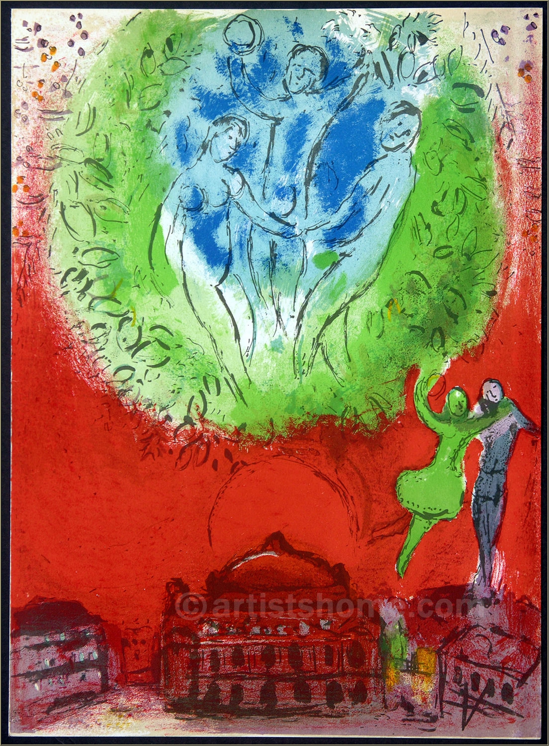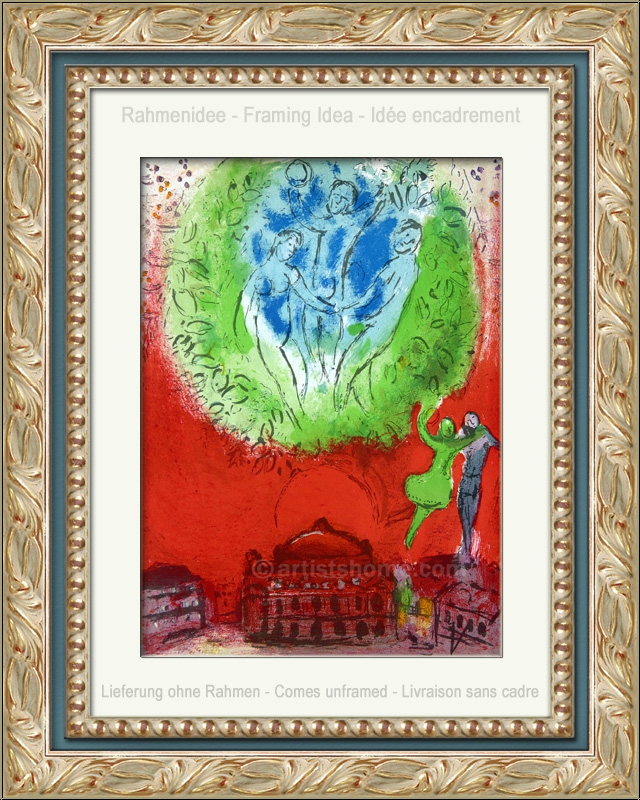 Details:Die Pariser Oper ("L'Opéra de Paris") Prachtvolle Grafiken wie "Die Pariser Oper" sind es, in denen Marc Chagall seine unbändige Lust auf Farben, Unbeschwertheit und Lebensfreude zum Ausdruck brachte. "L'Opéra", mit dem tanzenden Paar über den Dächern von Paris und dem maigrün und zartblau dargestellten Akt aus einer (fiktiven?) Oper ist sicherlich eine seiner schönsten Lithographien überhaupt. Dass er für das ehrwürdige Opernhaus in späteren Jahren das berühmte Deckengemälde anfertigte, zeigt seine Verbundenheit mit den darstellenden Künsten, aber auch mit diesem imposanten Gebäude, für das er in all seinen Bildern stets intensive, leuchtende Rottöne verwendete.