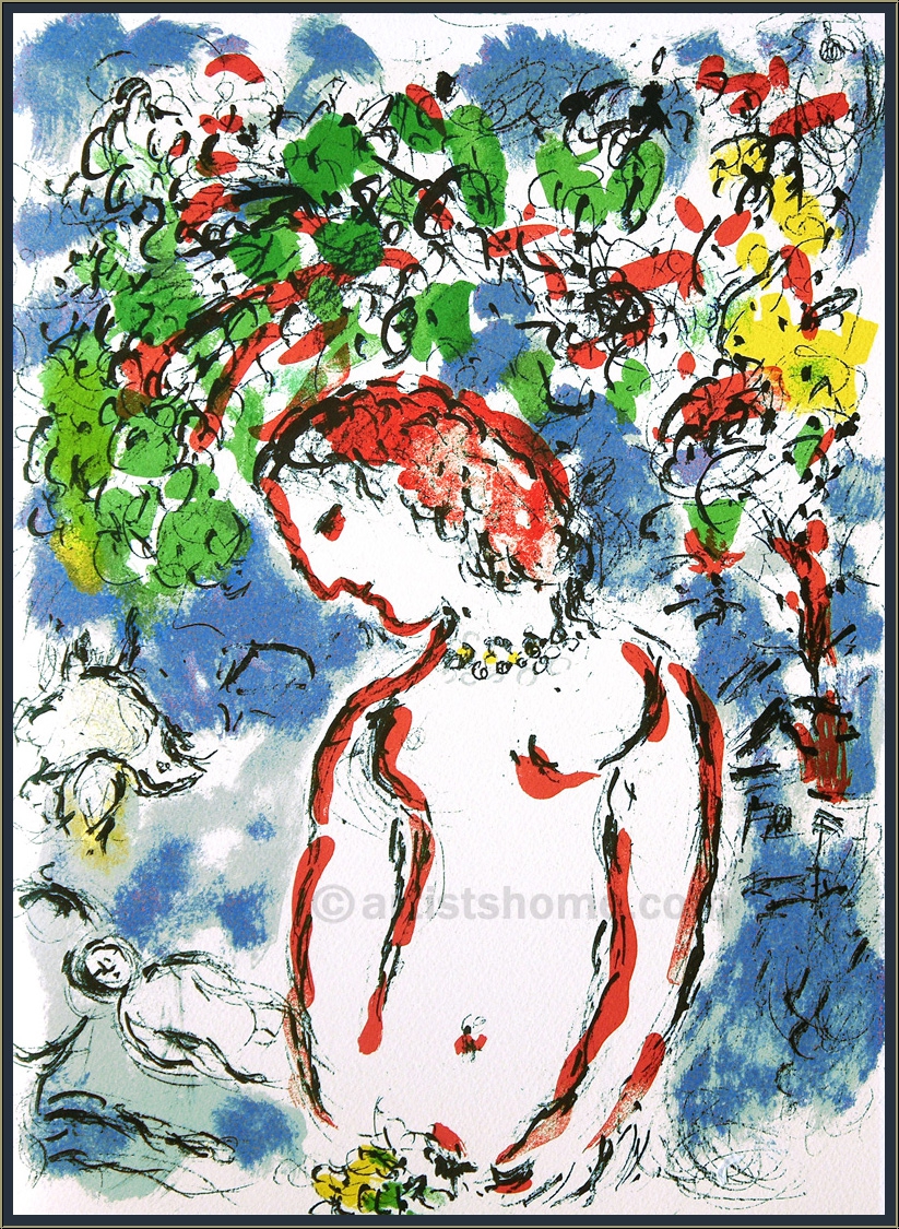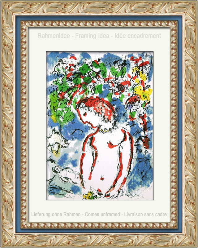 Details:"Jour de Printemps" (Frühlingstag) Der Winter 1971/1972 muss ein besonders langer, dunkler gewesen sein, denn in dieses Bild, das Chagall zu dieser Zeit als Steindruck arbeitete, legte er seine ganze Sehnsucht nach Helligkeit und erblühender Natur. Ein wahrer Regen aus bunten Blüten und frischem Grün ergießt sich über die melancholisch wirkende Figur, vor einem strahlend blauen Himmel. Endlich, endlich Frühling!