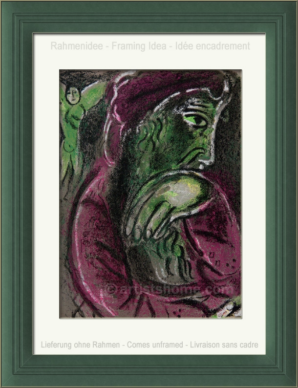 Details:"Hiob in der Verzweiflung" Die tragische Geschichte des frommen und ethisch so integren Hiob hat Chagall so sehr berührt, dass er ihm in seinem zweiten Bibelband zwei Grafiken widmete. Der verzweifelte Hiob, den wir hier sehen, scheint von einer Katastrophe in die nächste zu geraten, und das trotz seines tiefen Glaubens an Gott. Als selbst Freunde über ihn richten, scheint er aufgeben zu wollen. Dunkelheit umgibt ihn, zutiefst besorgt, krank und traurig wirkt er, den Kopf ratlos auf die Hand gestützt. Aber es wäre nicht Marc Chagall, wenn er den Verzweifelten ohne jeglichen Trost ließe - ein grüner Engel links oben im Bild scheint darüber zu wachen, dess es nicht zum Allerschlimmsten kommt. Noch kann Hiob den Sinn dieser Prüfungen nicht erkennen und fragt sich bei jeder neuen Hiobsbotschaft, wie es sein kann, dass Gott ihn so hart bestraft. Dennoch hält er ihm die Treue - und wird am Ende dafür belohnt.