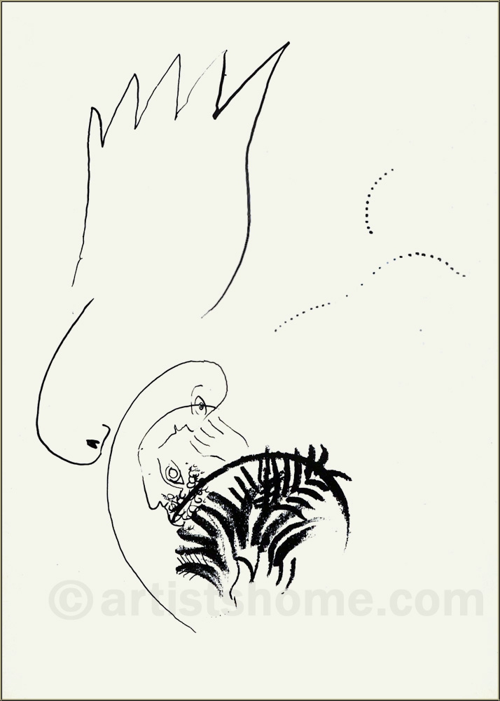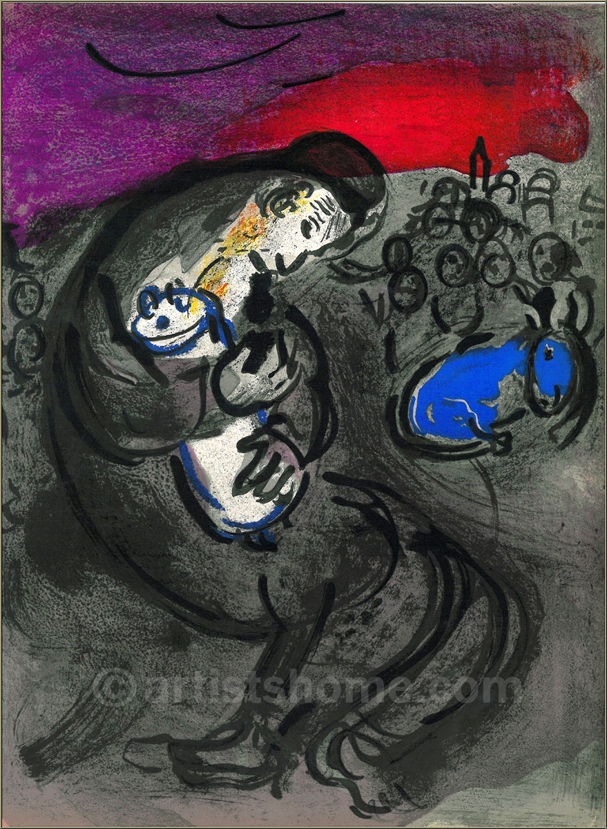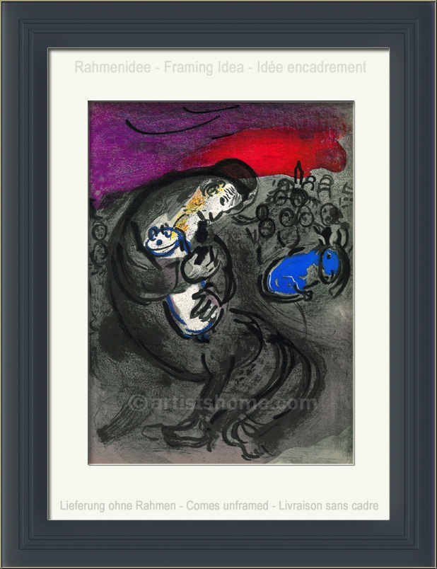 | | "Klagelied des Jeremia" (Die Propheten) In seinem ersten Bibelzyklus hat Marc Chagall den Propheten besondere Aufmerksamkeit geschenkt. Zwei seiner Zeichnungen auf Lithosteine hat er Jeremia gewidmet, dem tiefgründigen und durch die Verantwortung seiner Berufung zum Propheten mit Sorgen um sein Volk geplagten Prediger. In seinen Armen die Thorarolle fest an sich gedrückt, scheint Jeremia die Menschen um ihn herum nicht wahrzunehmen. Versunken in seine oft gefühlte Einsamkeit trägt er einen der zahlreichen Konflikte aus, betrauert seine Isolation oder hadert gar mit Gott wegen der Schwere seines Amtes. Jeremias Klagelieder werden bis zum heutigen Tag in der jüdischen Tradition zu verschiedenen Anlässen und Feierlichkeiten vorgetragen. | Technik: | Original-Farblithographie (Steindruck), Mourlot Nr. 140 Rückseitig eine weitere, einfarbige Original-Lithographie (M 143) Hinweis: Dies ist KEIN Kunstdruck (wie z.B. Photo-, Grano- oder Offset-Lithographie aus einer "limitierten Edition"), wie sie zuhauf im Internet zu finden sind, sondern die Original-Lithographie (Steindruck) von 1956, die exakt so auch im Werkkatalog verzeichnet ist. | | Jahr: | 1956 | | Größe: | 35,5 x 26 cm (Darstellung = Blattgröße) | | Auflage / Papier: | Hier eines von 6.500 unsignierten Exemplaren auf glattem, kräftigen Velin. Zusätzlich wurden 75 vom Künstler signierte und nummerierte Exemplare auf Arches Bütten aufgelegt. | | Verleger: | Éditions de la Revue Verve, Tériade, Paris | | Druck: | Mourlot, Paris | | Anmerkungen: | Bibelstelle(n), auf die sich dieses Bild bezieht: Jer 8,18 ff; Jer 9,9 Die beiden Bände des legendären Kunstmagazins Verve mit seltenen Original-Lithographien von Marc Chagall - "La Bible" und "Dessins pour La Bible" (Bilder zur Bibel) - wurden 1956 und 1960 von dem Kunstkritiker und Verleger Tériade herausgegeben. Seither wurden zahllose Kopien (Kunstdrucke) dieser Lithographien in den Verkehr gebracht, die so wenig mit Originalgrafik zu tun haben, wie die Bilder in einer Tageszeitung.* | Werkverzeichnis/ Referenz: | Cain, Julien, u. Mourlot, Fernand. Chagall Lithograph [I], André Sauret, Monte Carlo 1960, S. 149-160, Nr. 140 + 143 Sie erhalten mit der Lieferung den Auszug aus diesem Verzeichnis, sowie zusätzlich zur Rechnung einen Identitätsnachweis (ohne Preisangabe), falls das Blatt verschenkt werden soll. | | Zustand: | Erläuterungen hierzu Wohlerhaltenes, schönes Exemplar! Lieferung: ungerahmt. | Kundenbewertungen Bisher wurde noch keine Bewertung abgegeben. Bewertungen können nur von Kunden geschrieben werden, die den Artikel gekauft haben und eingeloggt sind. Ihre persönlichen Daten werden automatisch anonymisiert (Beispiel: "Jens H., Deutschland").  *Gültig für Lieferungen nach Deutschland bei Zahlung per PayPal. Bei Zahlung per Banküberweisung verlängert sich die Lieferzeit um 1-3 Tage ab dem Tag, an dem Sie überwiesen haben. Lieferzeiten für andere Länder sowie Informationen zur Berechnung des Liefertermins finden Sie hier |